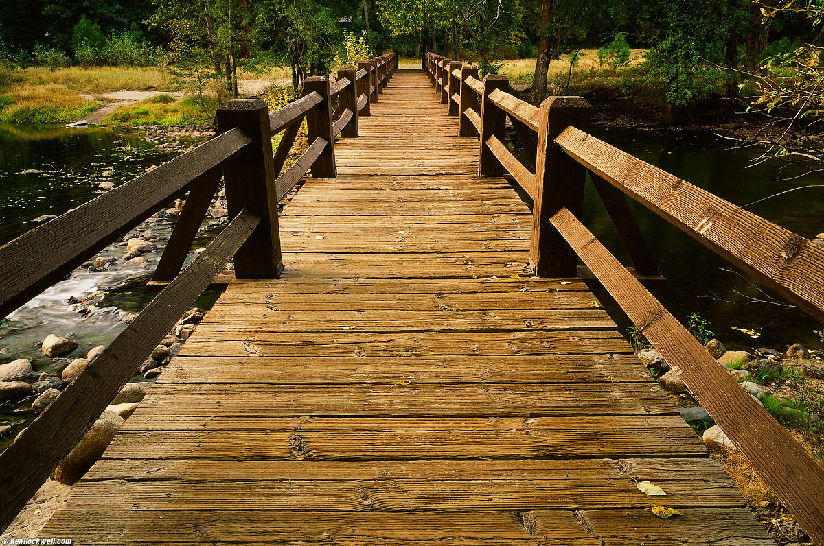 05 November 2008, Wednesday I have a Canon SD880 in my pocket to run through the laundry — whoops — wringer for a detailed review. Let's see if I can crank out any snaps like I with the G10 last month. The great thing about taking a couple of weeks to review compact cameras like the G10 and SD880 are that their prices have already dropped about $25 by the time I get to printing the review. The G10 has dropped to $475, down from $499 at introduction and down from $485 last week when I published the review. The SD880 already has fallen to $259, and I thought it was a great camera at $289 last week. Heck; that's news: this digital stuff gets cheaper every other day! Of course that's also why they're worthless when you're done with them in a few years. Digital cameras are perishable, just like milk and eggs. Use them before their (confidential) expiration dates. Scarier, digital cameras usually contain lead, mercury and lithium and all sorts of other dangerous materials which make them illegal to throw away in most countries. Unlike rotten eggs, you're stuck with your digital camera if you don't dump it soon enough. Oh well, no other digital news today. Thank goodness! The Canon 5D Mark II still doesn't exist: there are no production models available for sale; mine has been on order since September. Ditto for the Nikon D3X, which hasn't even been announced, much less orderable. With that, I've been updating and homologating my Why We Love Film article. I've added things like an example of why noise reduction makes digital cameras look sucky. Bridge across Merced River. enlarge. I'm just messing with you; this is a shot from 35mm film last month in Yosemite Valley, made on Velvia in a tiny Contax G2 with a Zeiss 28mm lens and most likely an 85A (strong warming) filter.