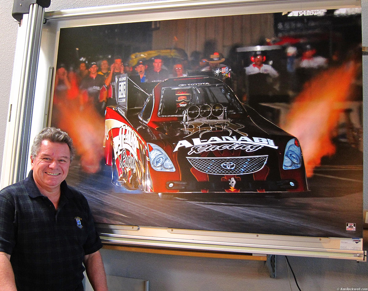 Observed Richard Shute with a 40x60" print — from a D40. bigger. As I dropped off my film at North Coast Photo yesterday, motorsports photographer of the year Richard Shute called me over to look at this huge 40 x 60" (100 x 150cm) print he had just made and mounted. It's awesome. It's a whole lot more awesome in person. Richard has been shooting cars for a living for a long time. He shoots and has shot with just about anything. He took my tip about the D40 having 1/500 sync, which he uses when shooting sports with fill flash. He shot this with the D40, and it looks great! Richard really knows what he's doing. 6MP is more than enough for mural-sized prints if you know how to shoot (and even gigapans look awful if you don't). Of course it's always about the photographer, and to some extent the lens, but never about the camera. Richard shot this with a Nikon 300mm f/2.8 VR, which is 100% compatible with the D40. That might seem like a expensive lens ($5,000) to shoot on a $400 camera, but no! In five years, a $5,000 lens will be worth $5,500, but a $5,000 digital camera like a D2H is now worth only about $500. The smart money always goes to lenses. He also owns North Coast Photo. When a top photographer owns the lab, you know we're all going to get great results. He makes these huge prints right there for anyone, and they are real chemically-processed prints on Fuji Crystal Archive paper, not smeary inkjet imitations that will fade. These huge prints are new, so they're not on the online price lists yet. Phone them at (760) 931-6809 if you need more information. 01 February 2010, Monday Video: Marc Silber's interview with Rock Photography legend Michael Zagaris