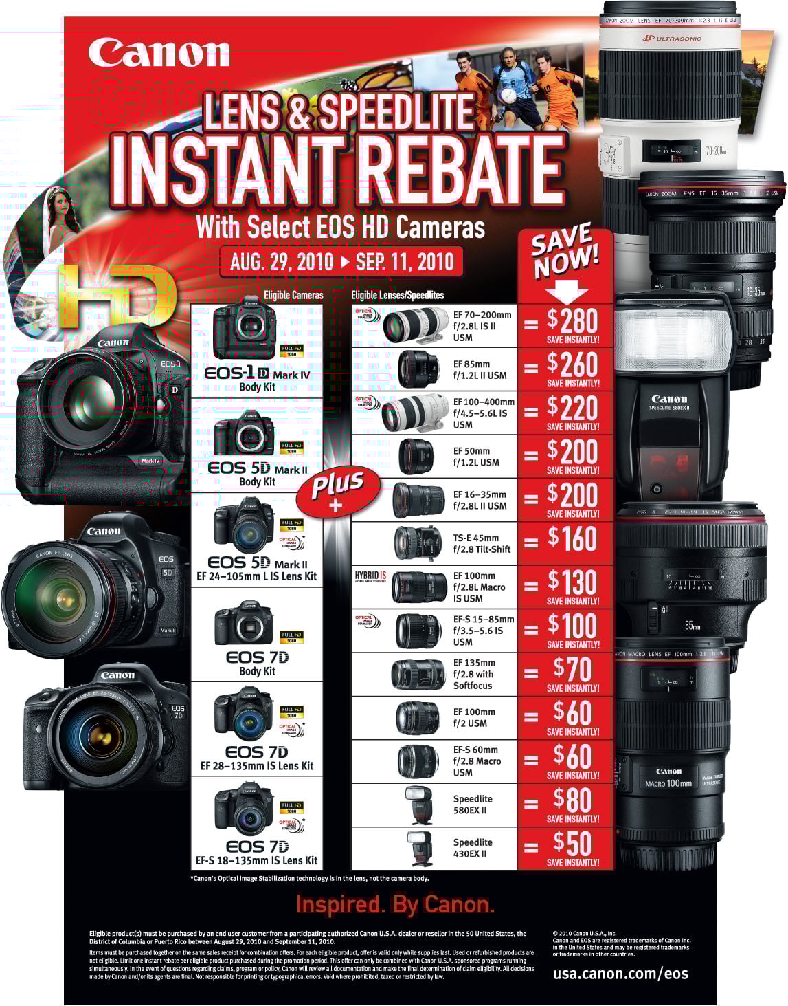 Not to be outdone, Canon is offering much the same thing: instant rebates if you buy a body and a lens: NEW: Canon package rebates with the 1D Mark IV NEW: Canon package rebates with the 7D NEW: Canon package rebates with the 5D Mark II