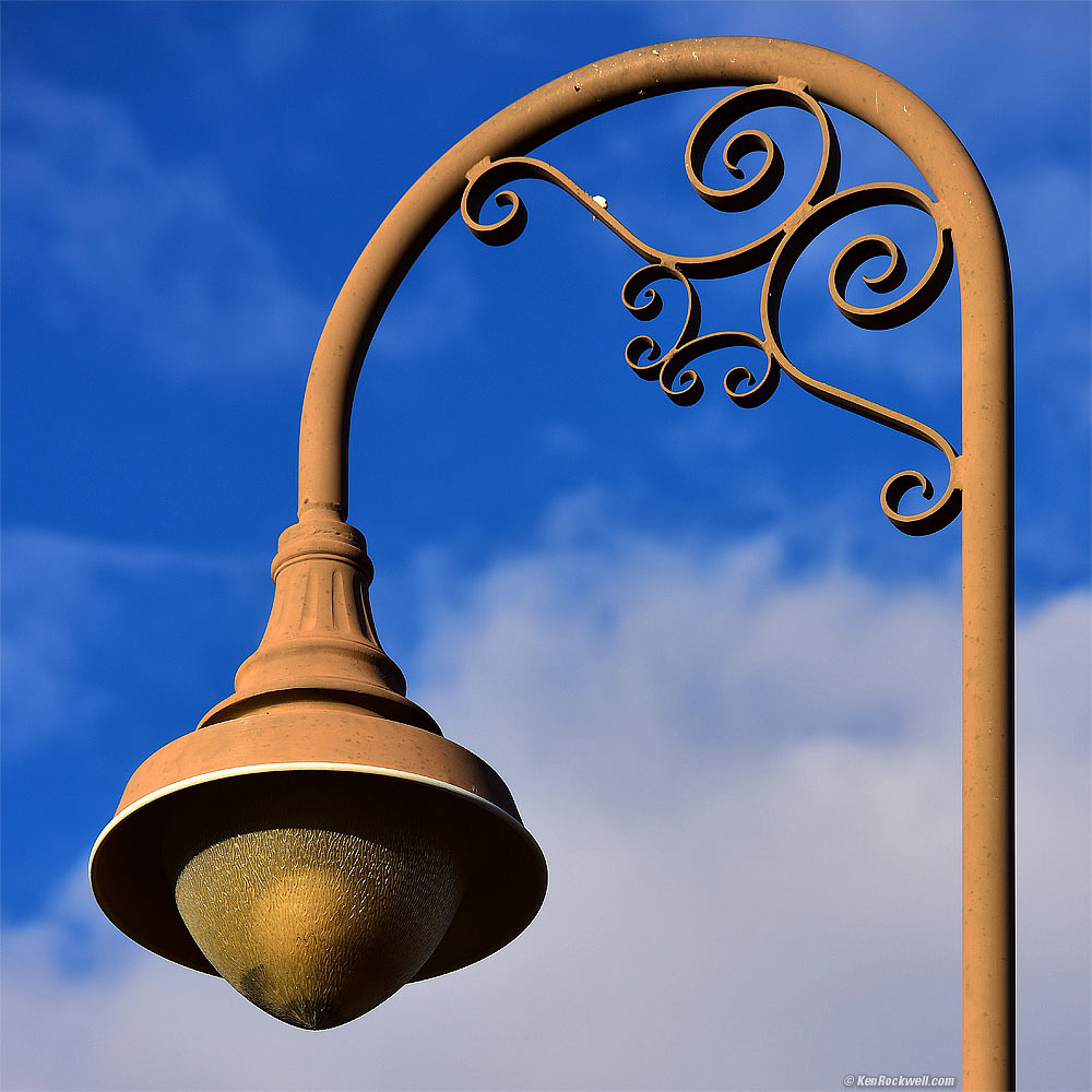 Route 66. Nikon D810, NIKKOR 35mm f/1.4 AI-s, f/11 at 30 seconds at ISO 100 on $50 Dolica GX600B200 tripod with Mini Magic Ball head, processed in Perfectly Clear. Bigger or full 36 MP resolution. It's been a long time coming, but for laughs I ran out of the house to this weekend's Route 66 Photo Tour with my D810 — and four vintage manual-focus NIKKOR lenses instead of the usual plasticy zooms Nikon wants you to buy today. Worse, today's plastic AF 35/1.4 G has a rounded diaphragm, so I wouldn't have gotten the awesome sharp star points on the street lights. I might have gotten more flare, too. I'd never bothered shooting real work today with my classic NIKKORs since I always have a brand-new lens to test, but since what's on my review desk is all Canon right now, I figured "Why not?" and grabbed some favorites from years gone by. Holy cow, do my images look great: sharp, detailed, colorful and contrasty all over. Something Canon has never been able to do is use its classic FD lenses on modern cameras. Canon flushed all it's "timeless" FD lenses and their users down the potty in 1987 when it introduced the completely incompatible EOS system we love today. Of course for shooting autofocus, the EOS system is decades ahead of Nikon's system today, which carries so much baggage from its introduction in the 1950s that Nikon today is sort of like Canon in the 1970s: a system of lenses and cameras that had been around through so many iterations that most of us have forgotten what lens works on what camera. Half of Nikon's AF lenses sold new today, like the 50mm f/1.4 AF-D, won't autofocus on Nikon's most popular DSLRs sold today, like the D3300 and D5500. Anyway, turning this to our advantage, the main advantage of Nikon's DSLRs is that they work perfectly with all our classic manual focus NIKKORs, compete with automatic exposure, automatic diaphragm control, full color matrix metering and EXIF data. Sure we can adapt these to LEICAs and Canons, but we loose everything and even have to stop down the diaphragm manually before each exposure, and open it again by hand for the nest shot, just like it's 1915 again. It was a blast shooting a modern body with my classic lenses, which feel better in my hand than my LEICA lenses because the NIKKORs focus so much faster and smoother — something AF lenses don't do. My F6 or LEICA have no in-finder level, as my D810 does for use with my manual lenses. Little did I realize that I've been of so right all along: my 30 and 40 year old lenses gave me results as sharp as all the modern lenses! What we get in buying new lenses is autofocus and Program and Shutter-priority automation modes and VR, but for photography of things that hold still, manual focus lenses do everything we need — and are smaller, lighter and feel so much better, since they are all-metal mechanical masterpieces, not disposable offshored plastic poop. Anyway, I just got back and am previewing my images, and in a week or so I'll show them to you. The 4 lenses I brought are the: 18mm f/4 NIKKOR AI: optical design introduced 1974. I brought it because I honestly haven't shot with it in a long time. I usually bring a 20mm instead. 35mm f/1.4 NIKKOR AI-s: optical design introduced 1970. I brought this for low-light. 55mm f/3.5 Micro-NIKKOR AI: optical design introduced 1969. This is among Nikon's sharpest lenses; a normal lens that focuses super-close, too. It sells for about $50 today if you know How to Win at eBay. 80-200mm f/4.5n Zoom-NIKKOR AI, the "new" f/4.5 model with the rectangular rear baffle, introduced 1977. This is Nikon's sharpest 80-200, and is also much smaller and lighter than the 80-200 f/4 AI-s. It also sells for about $50 today if you know How to Win at eBay. These four lenses are more than enough for anything. Lamp, Barstow. Nikon D810, 80-200mm f/4.5n AI Zoom-NIKKOR at 135mm, f/8 at 1/250 handheld at ISO 100, processed in Perfectly Clear. Bigger or full 36 MP resolution.
