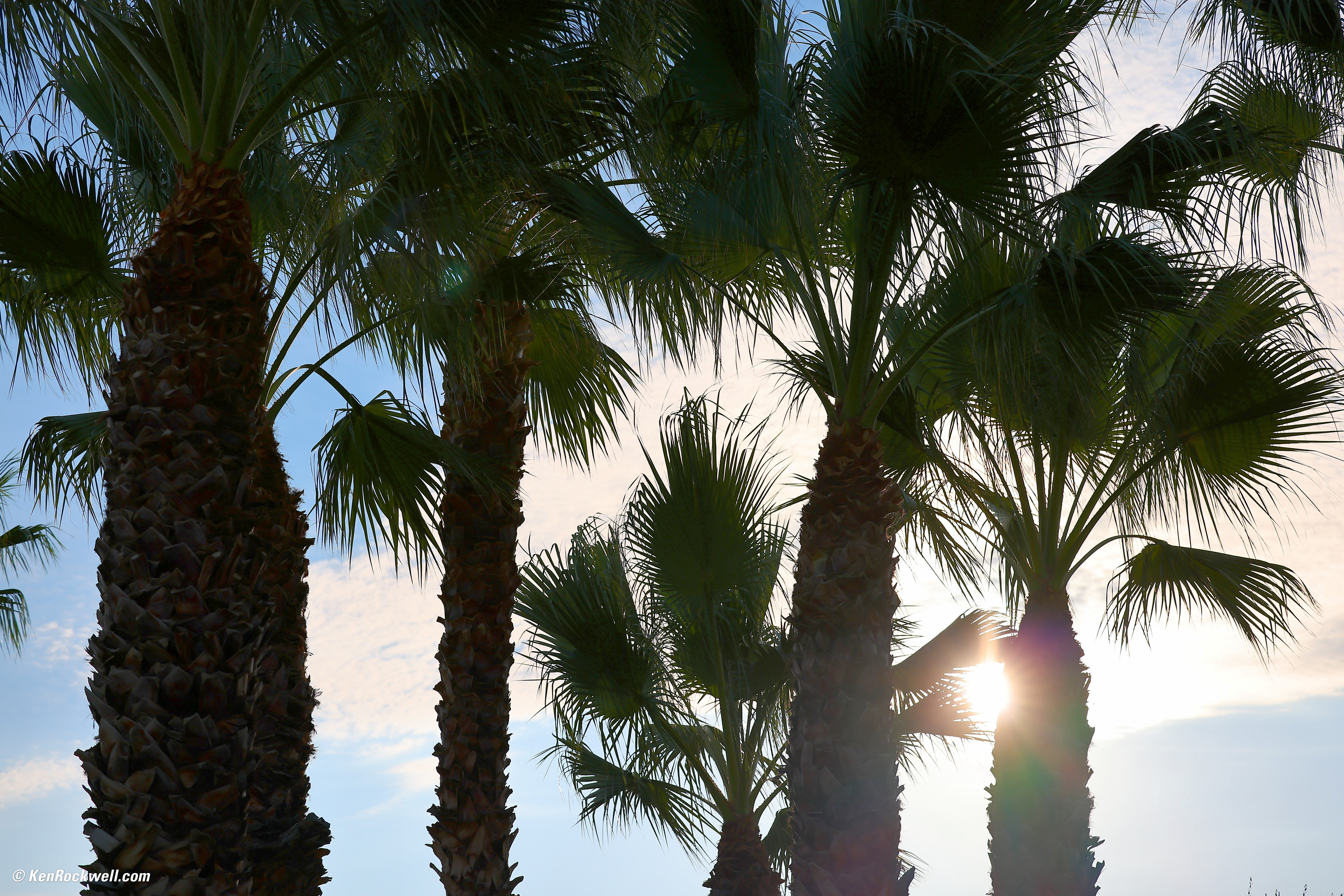 This said, I'm amazed at what range I get, especially shooting NORMAL JPGs as I always shoot. Here's a shot made directly into the morning desert sun today, and not only can I see detail in the clouds, I even can see detail in the trunks of the palm trees — that I couldn't see with my naked eyes staring into the brilliant morning sun!