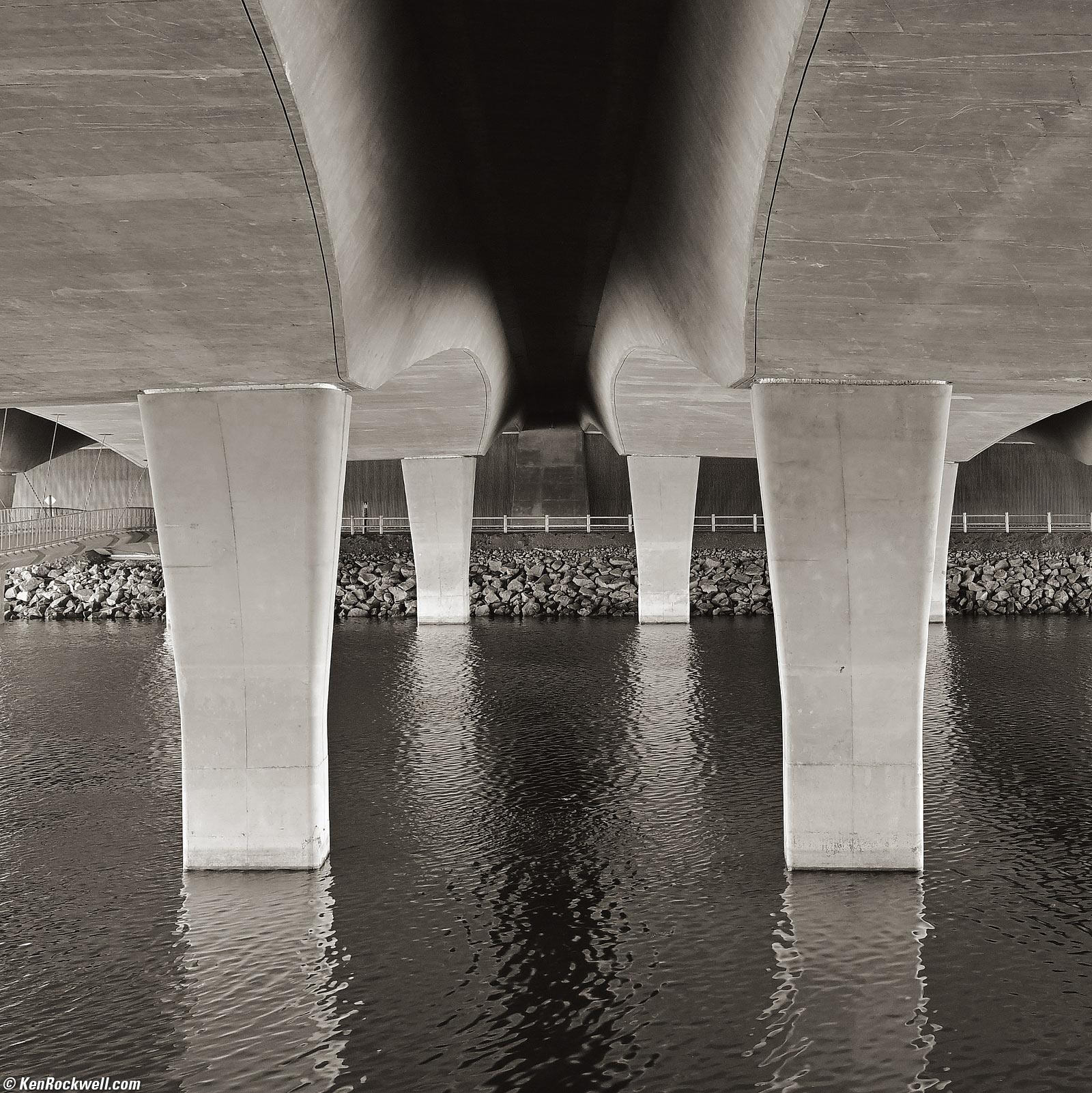 Under the Bridge, 4:38 PM, Sunday, 23 July 2023. Nikon Z8, Z 26mm f/2.8 at f/5.6 hand-held at 1/15 at Auto ISO 500 (LV 6.6), Perfectly Clear (now sold as Radiant Photo), split-toned print. bigger.