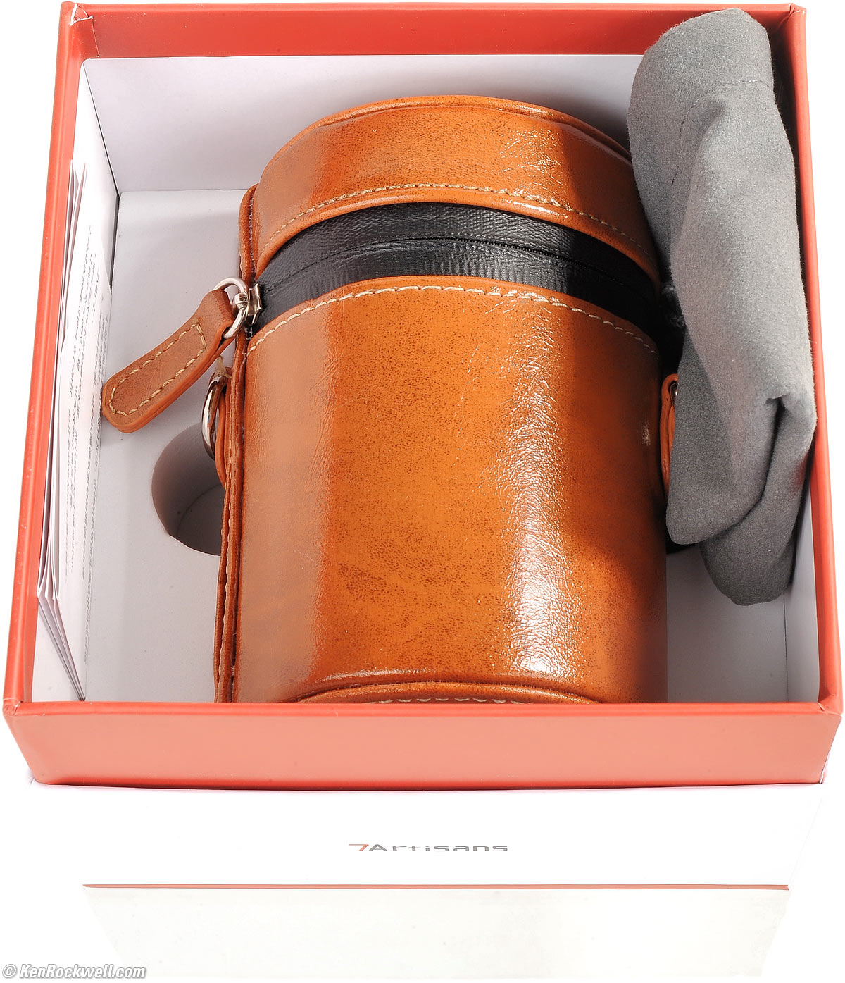 Included specifications toLens, caps, fake leather case, fuzzy bag and paperwork. Oddly, I couldn't find a strap for the case in my box: In the box, 7Artisans 50mm f/1.05. bigger.