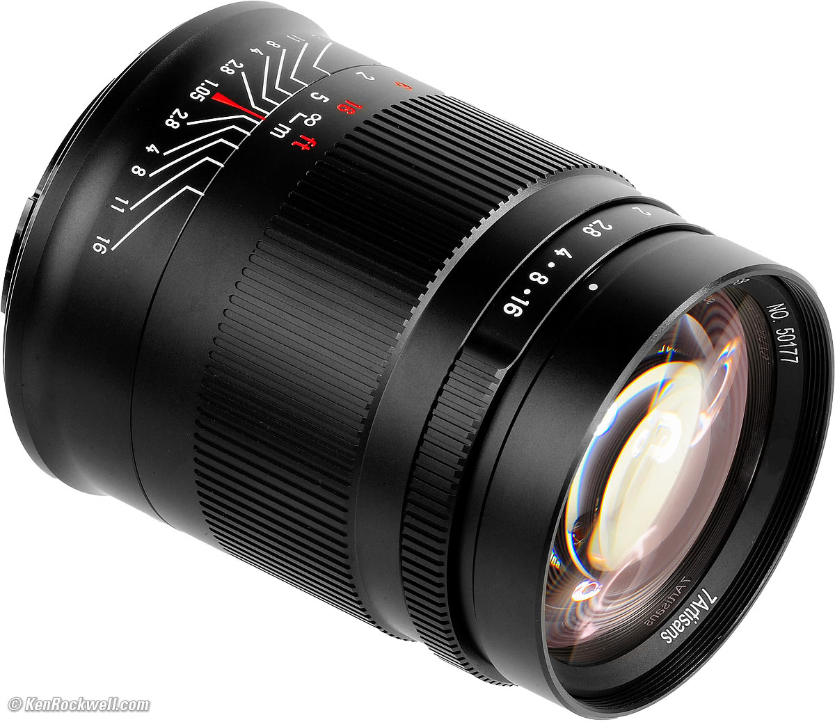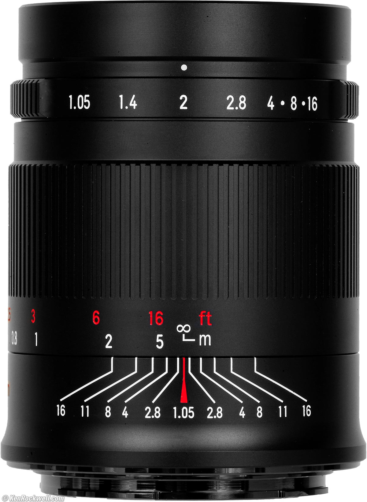 Ergonomics performance topFor a lens this simple it manages to get a lot wrong. The aperture settings are crowded very close together at the smaller settings, making it difficult to set precisely. The aperture ring is well damped. The aperture ring has no clicks, so you have to stop and look very carefully to set it. You can't see the index dot if you're behind the camera because it's hidden by the aperture ring itself. Therefore if you're on a tripod at eye level and can't look down on the lens as I've shown here, you can't see the index dot and have to guess! Focus turns smoothly with some play and some slight feel from the CNC router that carved it. My ultra-high-resolution product photos show everything more clearly than it appears in person. In actual use the red markings are very dark red, which is almost invisible against the black barrel except in very good light. It's not bright and clear as it looks here. The focus ridges aren't completely deburred so they are sharp, and therefore they scrape and collect dirt, spare skin and grit in the recesses between these ridges. The depth-of-field scale suggests much more depth-of-field than other 50mm lenses. It's calculated with about a 120 micron circle of confusion, not 30 microns as is standard for this format — so don't believe it. There is no mounting index other than a nearly invisible dot engraved on the mating surface of the mount.