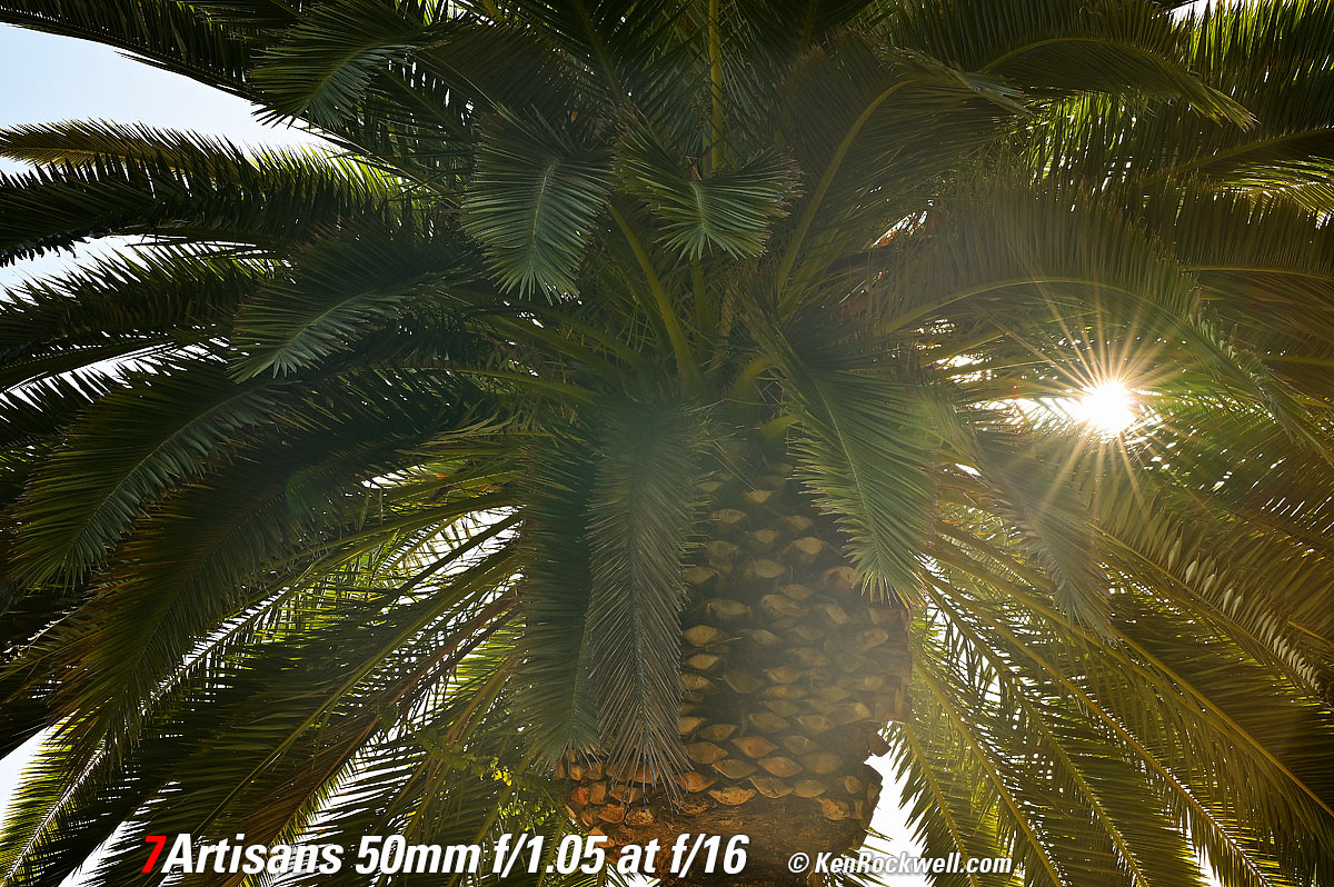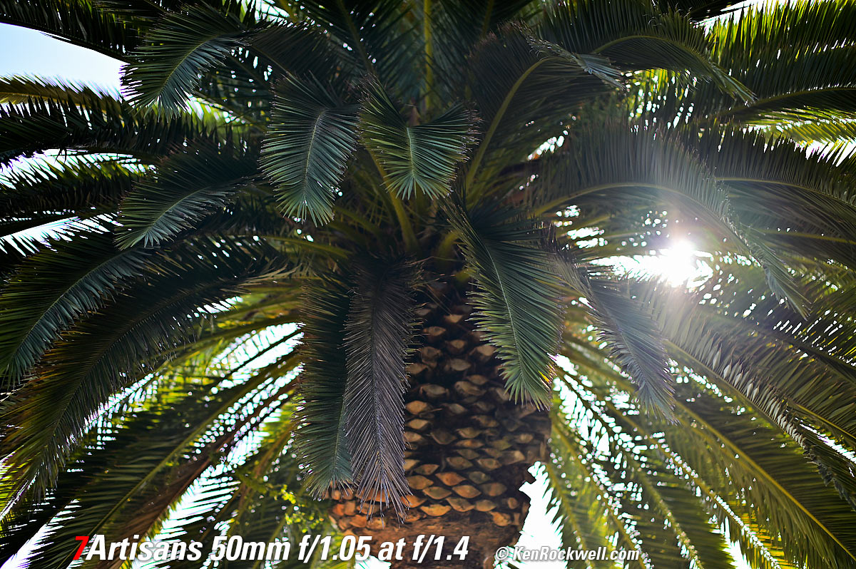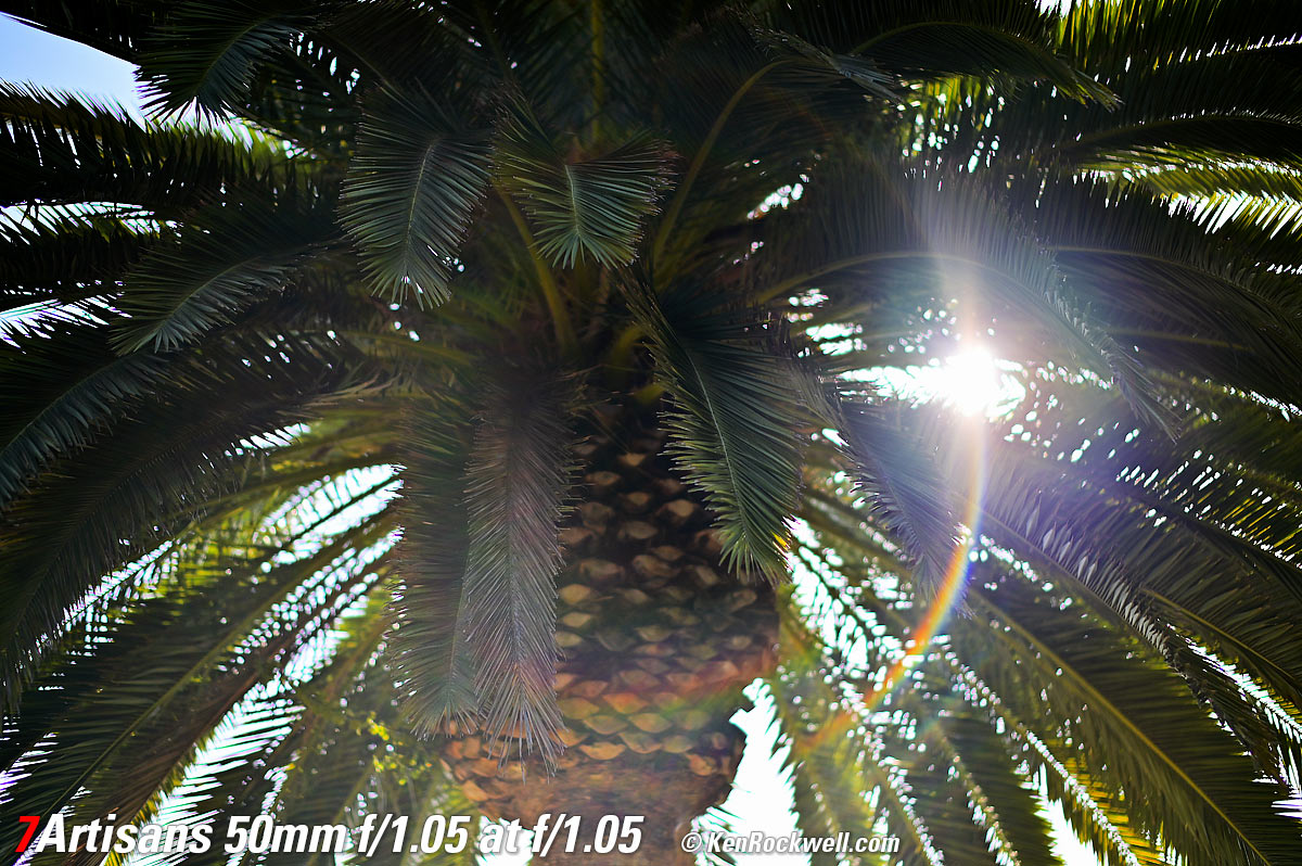 Sunstars performance topWith a 13-bladed diaphragm I can get exquisite 13- or 26-pointed sunstars on brilliant points of light at most apertures. They are sharp, but since there are so many of them they aren't that bright. Ignore the crazy rainbow effects at small apertures; these are sensor artifacts caused by taking a picture directly of the sun and exposing for the dark underside of a huge palm tree, and using that same palm tree to hide the sky to accentuate the stars. Ignore the weird circular smear at f/1.05; I suspect that may be a Nikon Z6 II artifact; I saw the same thing with a TTArtisan 50mm f/1.4. Click any to enlarge: Click any to enlarge.