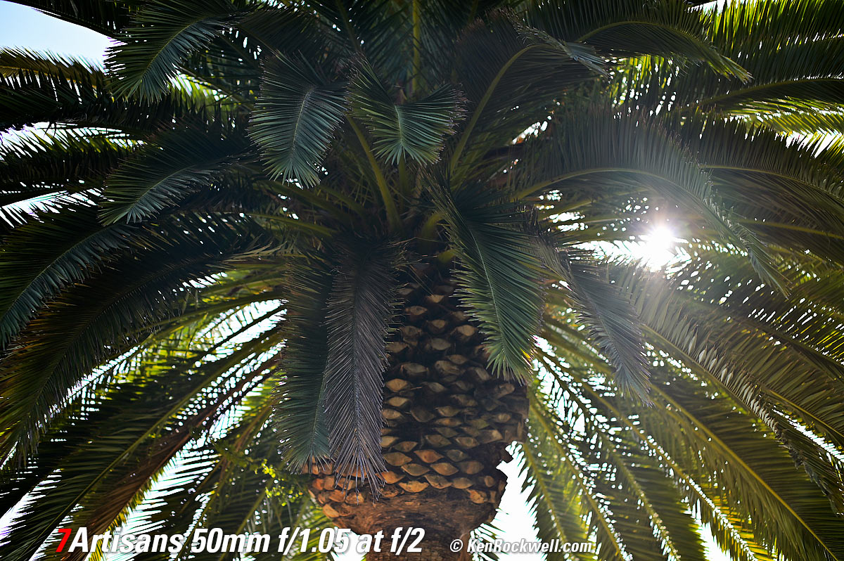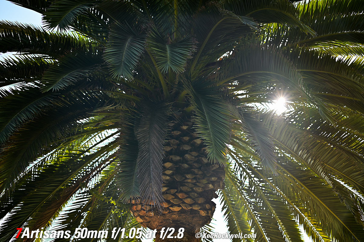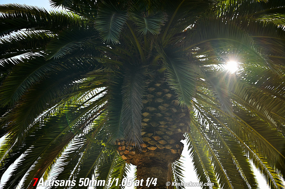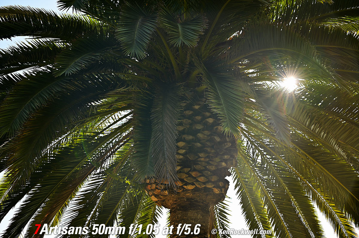 Sunstars performance topWith a 13-bladed diaphragm I can get exquisite 13- or 26-pointed sunstars on brilliant points of light at most apertures. They are sharp, but since there are so many of them they aren't that bright. Ignore the crazy rainbow effects at small apertures; these are sensor artifacts caused by taking a picture directly of the sun and exposing for the dark underside of a huge palm tree, and using that same palm tree to hide the sky to accentuate the stars. Ignore the weird circular smear at f/1.05; I suspect that may be a Nikon Z6 II artifact; I saw the same thing with a TTArtisan 50mm f/1.4. Click any to enlarge: Click any to enlarge.