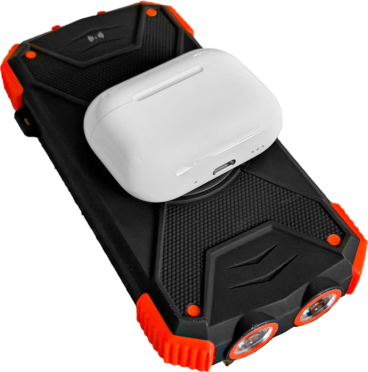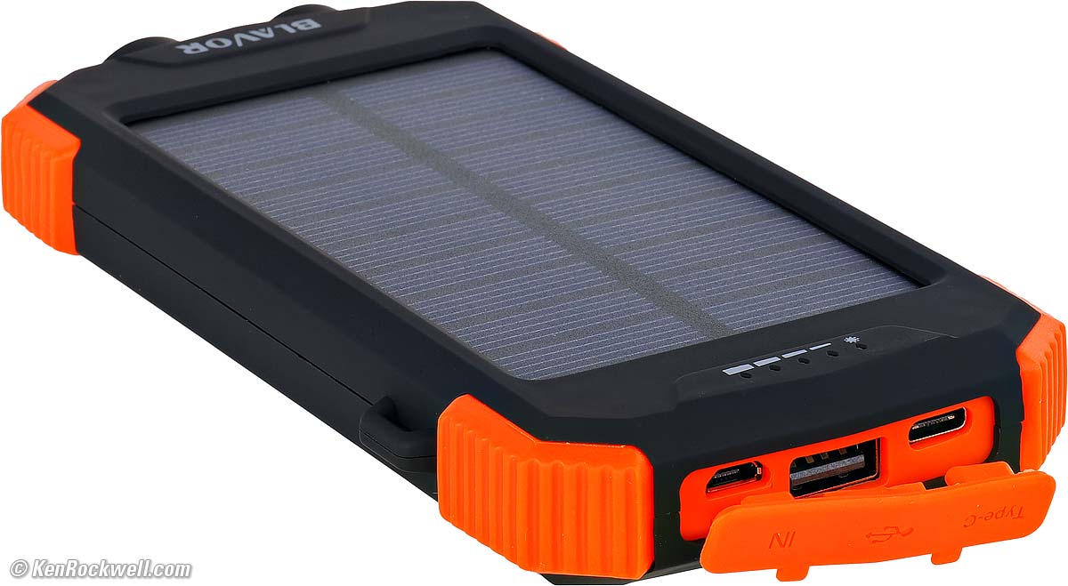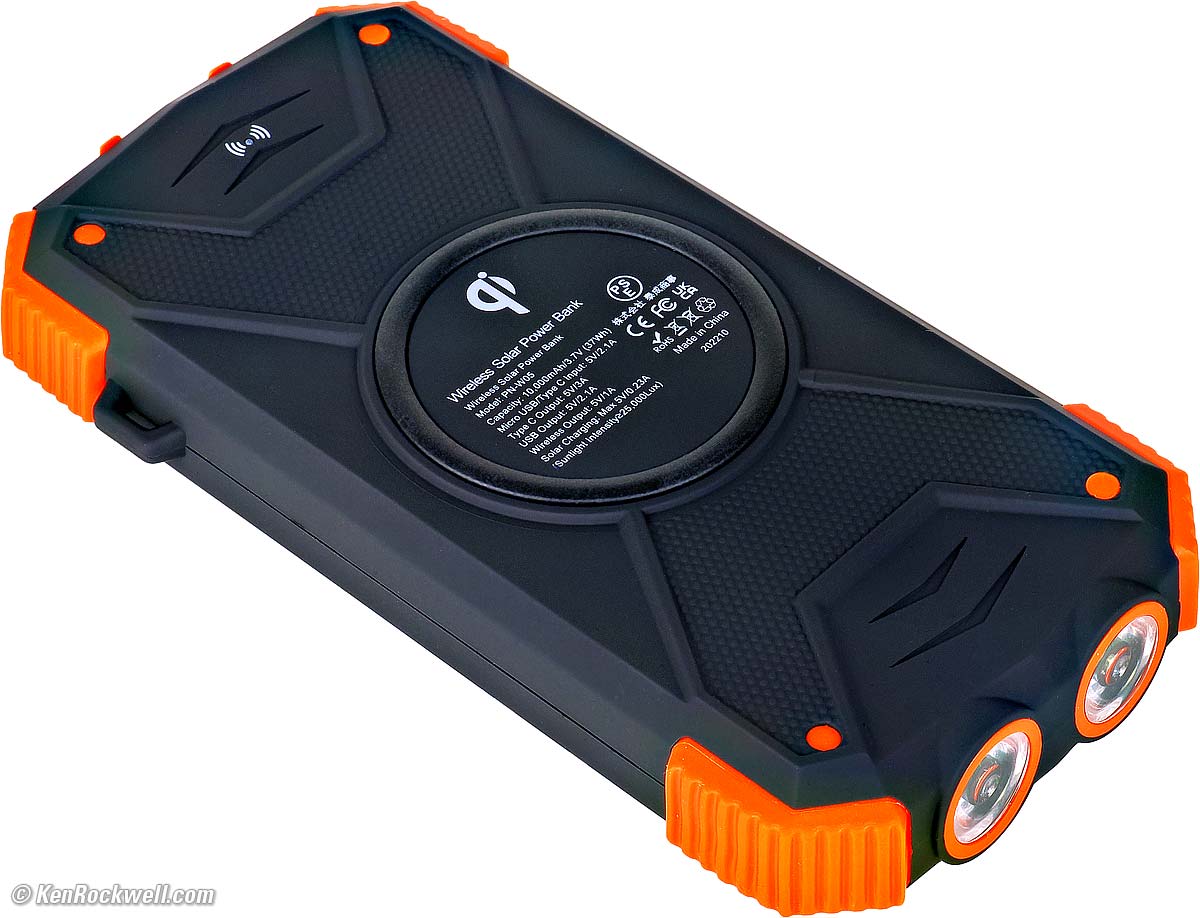 Blavor 10,000 mAh Wireless Solar: $27Blavor 10,000 mAh Wireless Solar, very roughly to scale. bigger. I got this cheaply made gizmo a couple of years ago. I wasn't going to mention it, but it's worked fine all this time and it does a lot of things almost for free, so it might be a great stocking stuffer, especially for kids or gadgeteers. It adds solar charging, a flashlight, a magnetic compass key ring and wireless charging that neither the 87W Anker A1383 nor Nitecore NB20000 Gen3 have. It's just a little smaller than the 87W Anker A1383 but bigger than the Nitecore NB20000 Gen3. It has better bumpers so it's probably more drop resistant, but it has only half the charging capacity (10,000 mAh versus 20,000 mAh or 35 Wh versus 70 Wh) of either of the other two, which is still plenty to charge a camera battery, or charge most iPhones. It has less charge speed, measuring just 13.4W output via USB-C. It charges cameras fast enough over USB-C, but it probably will take a week or more to charge itself with its small solar panel. The solar panel is mostly for looks rather or keeping the charge topped-off when not in use, not for daily recharging. It charges at 12W via USB-C in about six hours, not wining any prizes like the super fast 87W Anker A1383. It's perfect for wireless charging AirPods or my BMW Display Key, and it can charge my iPhone 17 Pro Max overnight wirelessly: