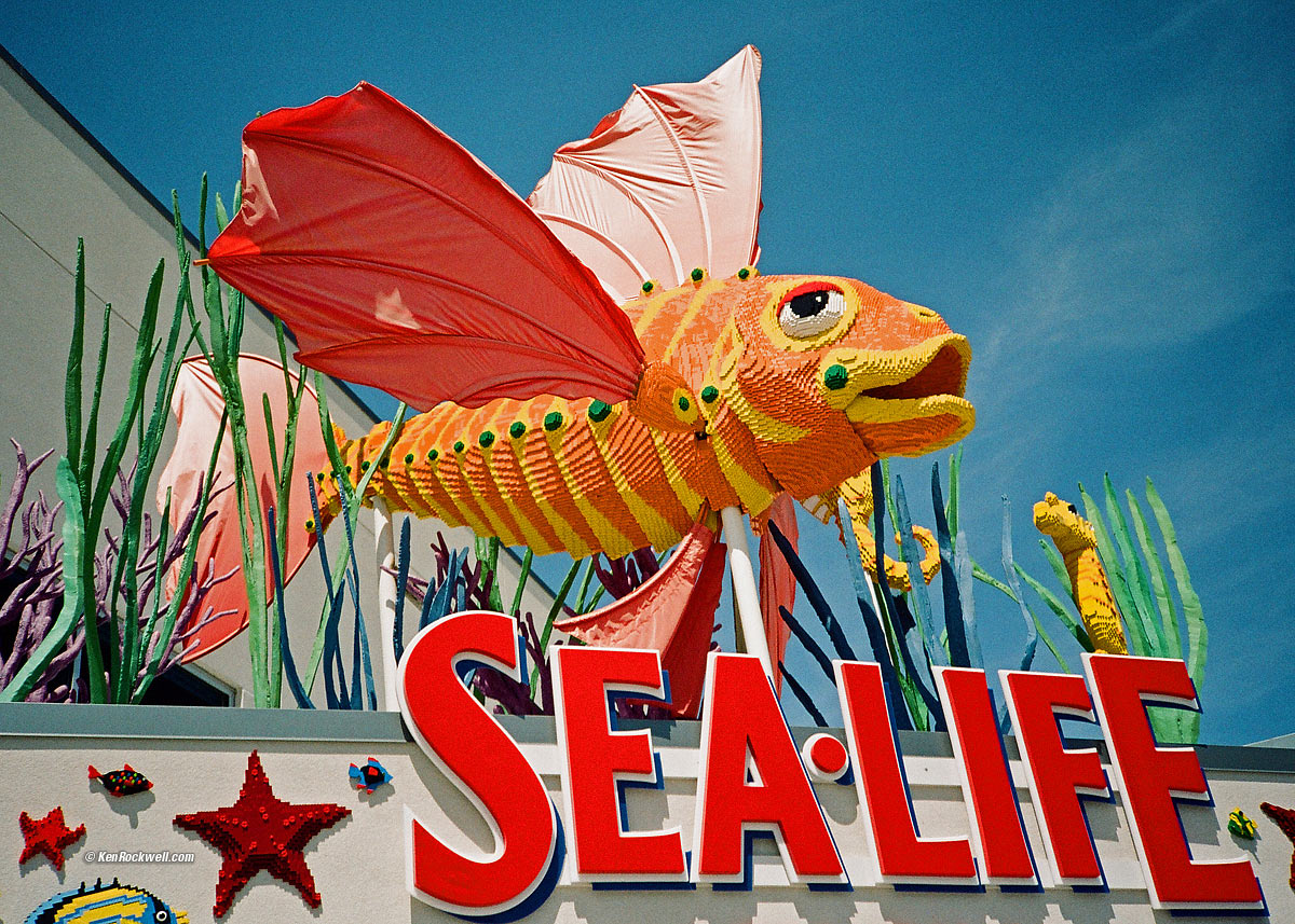 April 2012, May 2009 LEICA Canon Nikon Pentax All Reviews Introduction top Intro Specs Performance Recommendations The Chinon Auto2001 is a basic 35mm autofocus point-and-shoot from the mid 1980s. It reads film speed via DX coding, which are the black and silver squares printed on the cassettes. It works fine; here's a sample: Sea•Life Aquarium, California. Shot with Chinon Auto2001 and expired, made-in-China, Kodak Gold 100 print film. enlarge. The Chinon Auto2001 is a $3.50 point-and-shoot camera I picked up at a local thrift store. It works fine. It's a basic, cheap 1980s autofocus fixed-lens point-and-shoot. The only shooting control is the flash switch. I loaded some expired-in-2007 Chinese print film and had at it. NCPS processed the film, and it looks fine. I posted another shot from it at Ryan's website for 08 April 2009. Call me crazy, but this beater old point and shoot has its charms, like a far-faster wake-up time than a digital camera, and faster than other point-and-shoots since as soon as you slide open the barrier, it's ready to fire. Likewise, it has a perfect spring-loaded flash OFF - AUTO - FILL slide switch right by your thumb as you shoot. Why can't good cameras be thought out as well as some crappy cameras? How come no other camera has as smart a sliding flash-mode switch as this $3.50 camera? This Chinon goes the instant you flip open the barrier; you never have to wait for a lens to motor out from its burrow, and it had 3 LEDs in the finder to let you know the autofocused distance. Ryan loves sweeping, 08 April 2009. bigger. (Chinon Auto2001, Fill Flash ON, Kodak Gold 100-8 film, (expired 2007/06/01), NCPS process and scan.) Not bad for $3.50. As I wrote on 31 March 2009, I was more excited about heading out to The Flower Fields (after I drop my other film at NCPS) to try shooting this 35mm fixed-lens Chinon Auto 2001 point-and-shoot from 1986, that I just bought for $3.50 at a thrift store, than I was about shooting some of the ultra-expensive Leica gear that's wandered in here for review. It's probably because its more fun to try to make great images on crappy gear than it is to use great gear. It's also the treasure-hunt aspect: we know Leica lenses are going to be great. Big deal. I have no idea what I'll get from the Chinon. If I get anything, I'm going to be totally stoked, as if I just found the treasure!