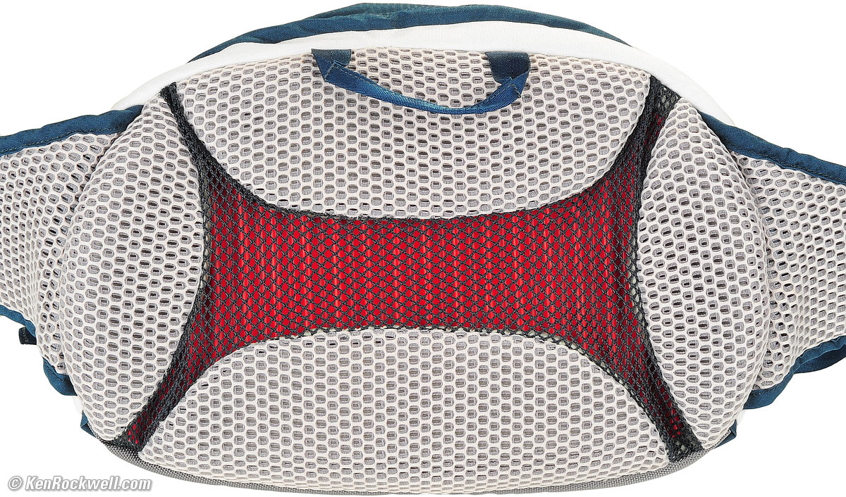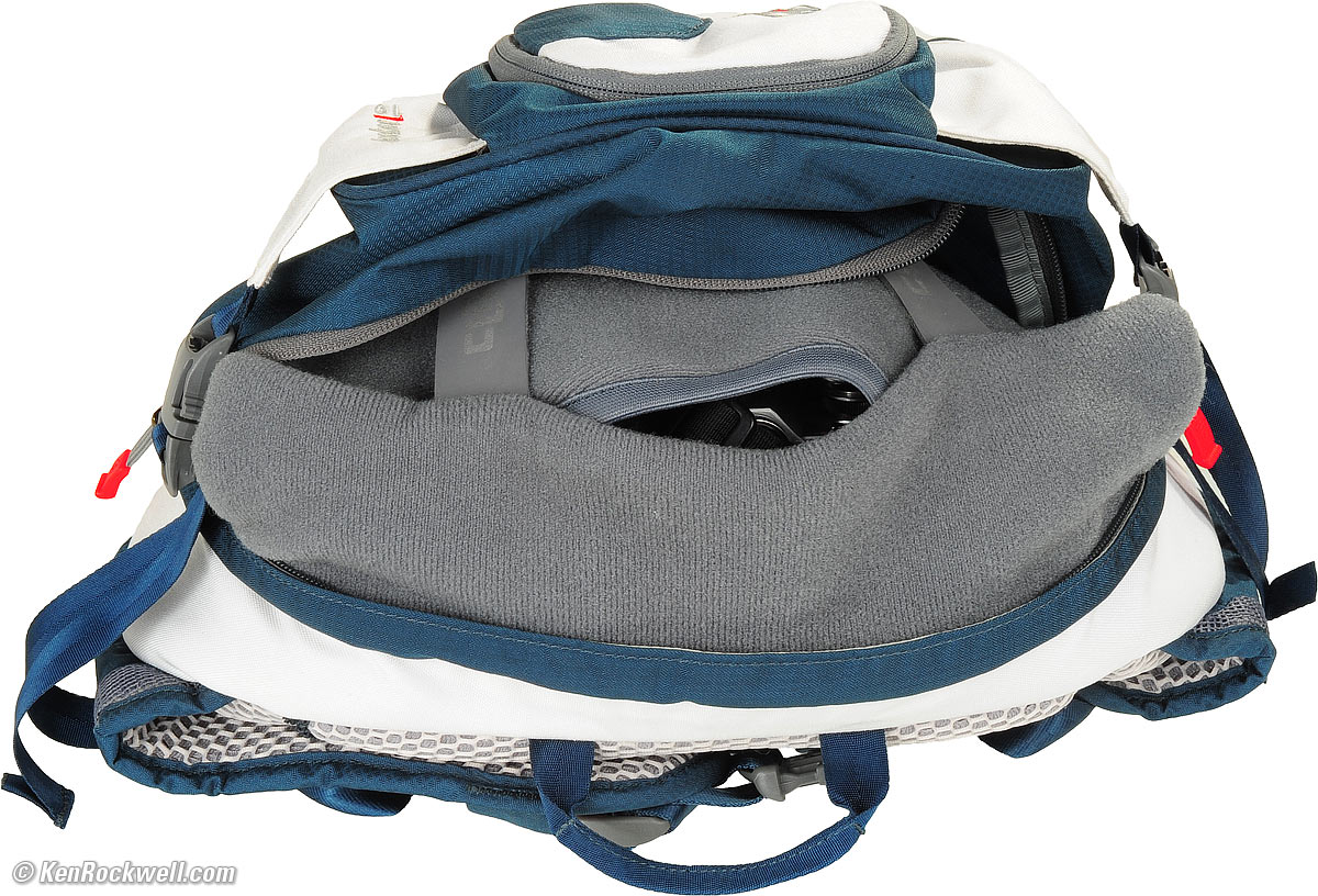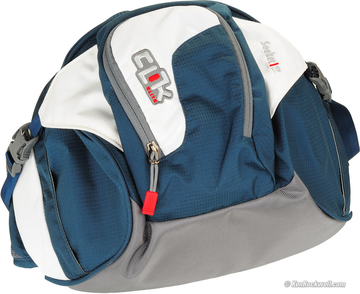 Review top The Clik Elite Seeker 10 is very different from conventional camera bags. The Clik Elite Seeker 10 feels and looks like a big running shoe. It is very light, very well padded, offers just the right level of support, and breathes well. The Clik Elite Seeker 10 is ideal for carrying cameras when you're running, hiking, cycling or climbing. It offers more physical protection from every angle than a normal bag in case you slip or crash, and it's designed to fit to your body and allow it to breathe and move easily. As seen from the top, it's more trapezoidal than other bags, so if you're rounding corners close to branches, you're less likely to snag them on the bag behind you. Back, Clik Elite Seeker 10. enlarge. See all this mesh? It breathes. See the orange center? That's a recessed corrugated sheet that isolates your cameras from your back, with plenty of airspace between you and the rest of the bag. The area between the orange corrugated plastic and the black mesh is a plenum from which air flows via the four vents around the white pads. As you run, air moves, and keeps you cool. The Clik Elite Seeker 10 is also designed to keep your camera stable as you run, so it won't beat a hole in your side after you've been moving all day. The big pads, just like the bottom of a running shoe, hold everything steady with motion. Unlike traditional bags, you won't feel your cameras and lenses resting against you. If I'm running to the summit of Mount Whitney and back in one day, this is the bag. Conventional bags like the Think Tank Speed Demon, at 35.540 oz (1,007.5g), weigh more, and aren't designed for strenuous physical activity on the part of the photographer. The Clik Elite Seeker 10 feels more like a big running shoe than a conventional bag designed for static photography. The Clik Elite Seeker 10 is much lighter and has much more padding than a conventional bag. Heck, its colors and materials even look like a running shoe! The penalty we pay with the Clik Elite Seeker 10, in exchange for super light-weight and extreme padding and camera motion control for active sports, is that it takes a few more steps to get into the bag and at our cameras than with a conventional bag. Top view, Clik Elite Seeker 10. enlarge. The Clik Elite Seeker 10 has no rain cover, but in over 25 years of using bags that come with these covers, I've never used one. What I would like is a bag more resistant to dirt, and lo and behold, the main zipper is behind a small dust flap. Yay! The zippers are smaller than conventional bags, which mean they don't pull as fast or as smoothly, and they also save weight. There are very nice pulls on the little zippers, but they are still little zippers that don't slide as well as larger ones. The straps stay tight when tightened. They use a leveraged block and tackle design. The center lift handle is dainty. It works, and saves weight compared to the larger handles of conventional bags. To open the Clik Elite Seeker 10, grab a bright red zipper pull (I tucked them into the flap for the photo; they are usually very obvious), and open the main compartment. Top view, Clik Elite Seeker 10. enlarge. When unzipped, you see the padded protective section for your gear. It closes over your gear with two big velcro straps, one on each side. All of the protective section is made of girl velcro (the fuzzy stuff), and the boy velcro is on the inner straps. I left it open a little; it usually wraps everything up tight, so no matter from what direction you get hit, your gear is protected.