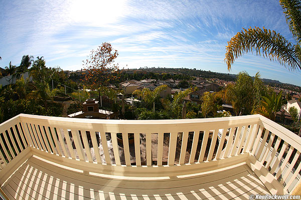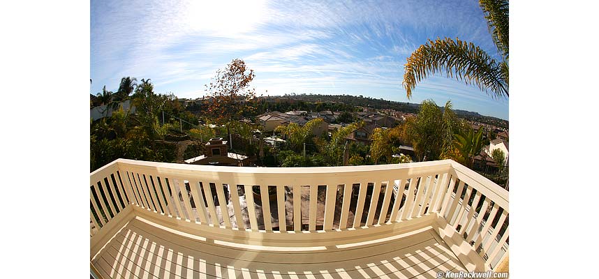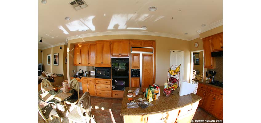 This shot of a kitchen covers 45 feet (15m) horizontally, and I was only 9 feet (3m) away from the far wall! That calculates to 135 degrees horizontally, which is the same as a rotating panoramic camera like my Noblex. The sobering difference is that the fisheye/software combo does this without the curvature. Each of these images has the same pixel height as the original file, and is even wider horizontally in this Max mode. Of course the sides get softer than the center because they must be stretched further. Try for yourself and see if you like the results. I love them! DxO also delicately lifted the shadows just a little. Perfect! DxO does a great job working with the image detail in the file. Fisheye lenses squish the sides together to create the fisheye look, and DxO very accurately pulls those sides back out to look straight again. Detail is lost when the image is squished by the lens, since the camera's sensor can't magically increase its resolution at the sides to match the squishing. When DxO stretches the image back into a rectangle it has to interpolate, so the farthest edges will look softer than the center, if you stick your eye too close to a big print or look at it at 100% on your monitor. This isn't an issue with software, it's an issue with reality. I find that my $2,000 Canon 14mm f/2.8L rectilinear lens (no distortion) isn't very sharp on the sides in the first place, so I see very little difference between an image from my $500 15mm fisheye and $300 DxO software compared to my $2,000 14mm lens. The sides look about the same, and the converted fisheye has less distortion than the unconverted 14mm. (Of course I use DxO to help with my 14mm, but that's not saving you any money.) If you look closely at the very far corners, the converted fisheye is a little worse, but you'll have to ask yourself if it's $1,000 worse. The biggest reason I usually use my 14mm lens instead of my fisheye is artistic visualization: with my 14mm I see the rectangular image as I compose through my viewfinder, and with the fisheye I have to extrapolate in my mind to imagine the final result and framing after conversion Canon vs. Nikon Fisheyes In the default mode both systems give similar results. They give results the same pixel size as the original file with the same angle of view, equivalent to a 12mm lens on a full-frame camera. The Max mode works differently between Canon and Nikon. These extra-wide images are from my Canon fisheye and full-frame camera. My Nikon 10.5mm Fisheye and Nikon digital cameras aren't as sharp at the sides as the Canon combination, and therefore DxO won't dare correct an image to be as wide in this crazy Max mode. Inputs DxO Optics Pro works with JPGs (my favorite) and raw. It doesn't do anything to your original files, JPG or raw. It always saves a new, corrected file wherever you prefer. I save the corrected files back into the same folder, which makes it trivial to keep track of it all. With my Canon 5D, the results were better from JPG originals! The results starting from .CR2 files had duller color and were less sharp than the same images converted from JPG. I pump up the color settings in-camera, so I suspect DxO isn't reading those settings when converting the CR2 files. Beats me why the CR2 results are softer, but just as well, since I hate the hassle of raw. In raw's favor, the lateral chromatic aberration correction was better. I don't bother with raw. I shoot ordinary JPGs. When I compared results from Raw+JPG on my Canon 5D, I preferred the conversion from JPG. Only the camera maker's raw conversion software will match the colors and tones of the JPG perfectly. When I shoot, I ensure that my JPG looks perfect, so I want my raw conversions to match my JPGs. Every other brand of software will make the tones and colors look slightly different. If you shoot raw and prefer different raw conversion software than DxO, use the raw converter of your choice to open the raw files, save them, and open the saved tiffs or jpgs in DxO. Outputs It saves outputs in as many different simultaneous JPG, raw and TIF options as you like. Ease of Use I figured most of it out before I found the user's manual. This is excellent! It all makes sense, which I wish all software did. It runs only as a stand-alone program. Even though a PhotoShop plug-in is offered, all this does is open up Optics Pro via FILE > IMPORT. You still need to make your file selections and settings inside of Optics Pro. It does not come up in the Filter menu. This isn't as much of a pain as I expected. I first missed the ability to process an image in Photoshop as a filter. A day later I realized that DxO does such great stuff that I usually batch-process entire folders from inside DxO Optics Pro, catalog the results in iView, and then select what I want to use in Photoshop from within iView. Workflow DxO converts from camera original files. Do your DxO corrections first and do any Photoshop work next. I shoot hundreds of shots at a time, and then use iView to sort and dump. I put each shoot in a folder. If I'm going to use DxO, I batch-convert everything that folder. God Bless DxO: it doesn't matter which lenses I used; it cranks through everything, automatically identifying how it was shot and processing accordingly. I set it up, and let it process while I work on something else. I have DxO drop the new converted files into the same folder. Ease of Tweaks A clever feature I wish I had in Photoshop is the ability to click on the plus or minus on each side of a slider to increment or decrement each by one unit. I can click while I'm watching the preview image. I need this for keystoning correction. Click on either side of the slider itself to slam the slider to the end. A secret in recent versions of Photoshop is the ability to click over a wide area around a slider or its name and drag to change the slider. In Photoshop you don't have to hit the slider itself. Perspective Correction First make the up/down 