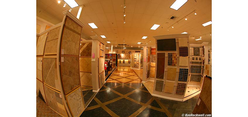The ease with which it works belies just how insanely wide this is - you'd need a nonexistent 7.2mm rectilinear lens on a full-frame camera to see this wide, a 5.7mm lens on a 1.3x Canon, a 4.7mm on a Nikon digital or 4.4mm rectilinear lens on a Canon 1.6x camera (Rebel, 20D, 30D) to see this wide. It's crazy; it includes a horizontal angle of almost 180 degrees, and does it without vignetting or distortion. Here's another hand-held snap made while carpet shopping with the wife the first night I got this: |