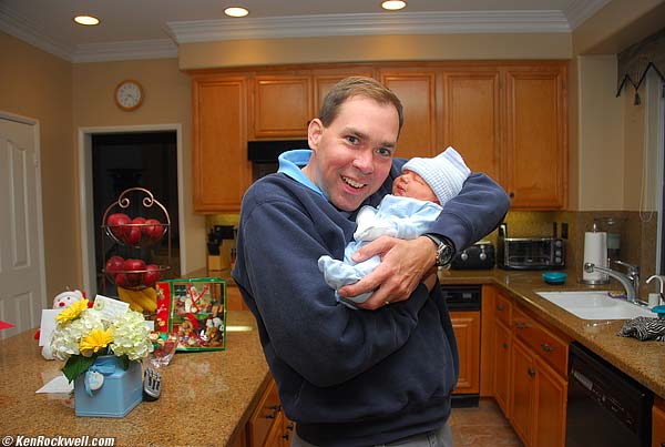 Janvier 2007 Specifications Performance Recommendations NEW: March, 2007: Version 4.2 was released. This entire review is of version 4.1 from January. The new version processes much faster and harder on my Mac Quad G5: it runs all four CPUs at 100% and causes my fans to spin up and my computer to draw 190 watts more power form the wall while processing! It processes four images in parallel and takes an average of only 9 seconds per image from my Canon 5D in batch mode. Guess what? 190 Watts is a quarter-horsepower! Yes, DxO uses a quarter HP while it's processing Images! I have it chewing on 60 images in series parallel as I write this. It's got my Mac Quad G5's fans blowing like a hurricane, and everything else, like Dreamweaver on which I write this and my browser and email, are humming along as if nothing else is happening. DxO is expanding a bunch of fisheye shots of real estate interiors. I rectify them as a batch, and sort them out after conversion. The rest of this review now proceeds as written in January: This software package from DxO really works, it's easy, and it works insanely well. All these examples are from my first day of fooling around. I could spend a lifetime trying to show everything this package does. What I can't show is how magically it identifies everything about the file, and just does what it needs to automatically. Get this package if you worry about lens defects or want to convert your fisheye images into useful linear images. Most people don't need either of those, so if you don't think you need it, you don't. If you worry about distortion, light falloff and color fringes, just go get this. It works! It corrects conventional lens defects as well as converting fisheye images back to regular, and much more. It's not a hoax: DxO has measured the optical transfer functions of the cameras and lenses it supports. The software applies the inverse of these previously measured transforms to your files to correct them exactly. DxO also makes the advanced analyzer software used to make these measurements, a key competence lacking in other software companies. For thirty years I've been looking forward to when I could transform (stretch out) my fisheye images back into something useful. It's just math, but back in the 1970s the technology to do this wasn't something anyone but first-world governments could afford. I wanted to project my slides back through my fisheye lens, but no projector had a condenser set up for that, and that would melt my lens anyway. (IMAX uses a similar process.) DxO is easy to get and use. Buy the version for your camera, and every lens they've characterized is included. Gone are the old days when they used to sell lens data separately. Hooray! Automatic Optical Adjustments DxO Optics Pro corrects optical imperfections. It fixes: 1.) Distortion (curved or wavy lines that are supposed to be ruler-straight), 2.) Lateral chromatic aberration (color fringes), 3.) Light falloff (darkened corners), and even corrects 4.) Some lenses' tendency to get softer in the corners. It can't correct for your own stupidity if you forgot to focus. It improves greatly on the performance of most of my lenses. It really works! The accuracy of these corrections is far better than anything I've been able to hack in Photoshop. DxO does this so well because they've measured all the supported cameras and lenses in their lab. The software then corrects exactly based on the exact settings used, even for focus distance! Baby photo by wife. Roll mouse over to see distortion correction. Also note how delicately DxO lightened the background. Nikon D200, SB-600 in bounce mode, Nikon 18-200mm VR at 18mm. Distortion and the dark background corrected automatically. I had to correct the tilts by moving sliders and cursors, which is why the after shot on mouse over zooms in a little. When you rotate you lose the corners and have to crop more tightly. Other Automatic Adjustments Unlike my camera and lens reviews, where I go into far more detail than any reasonable person ever needs to know, this software package does far more than I'll ever be able to explore. I got it for correcting optical defects and for rectifying fisheye images. I already got my $300 worth just with the automated lens corrections, and I only needed to spring for the $300 version to cover my Canon 5D. The $150 version is all you need if you're using any of the lesser Canons, or any Nikon up to and including the D200. Spend an hour or two reading the unusually clear user's manual and there's another $700 worth of features very clearly explained. It works much easier, faster and more intuitively than you'd expect. I had no idea these other features were in there, too. DxO Optics Pro fixes these automatically, meaning no inputs are needed to go off and optimize these: 1.) Automatically knows when to lighten dark shadows and other areas, and does it well. If you have a good shot, it leaves it alone. If you have a crappy one with overly contrasty light, only then does it fire itself up and dial in just the right amount of lightening. It does all this by magic, and you can tone down this feature, or turn it off, if you prefer. Here's a typical example: |