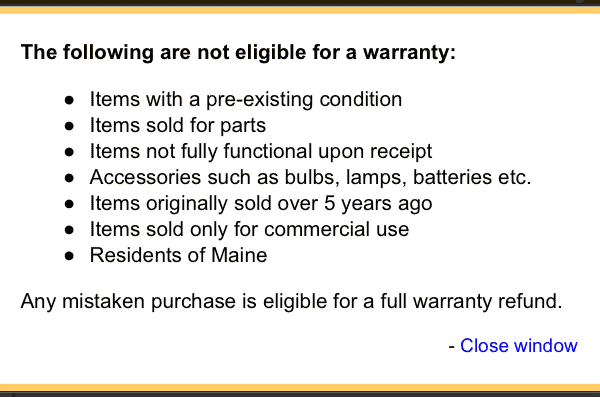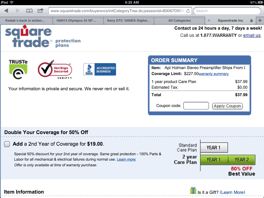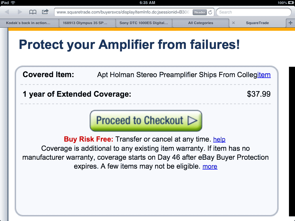 Bogus "Square Trade" Warranties Ignore sales pitches for warranties. I often get repeated pitches from Square Trade offering coverage, along with loads of claimed testimonials from happy customers. I decided to read the fine print, since for about $10 they offered several years of coverage for a used Nikon FA I had bought, and I know FAs occasionally need service. I'd pay their $10 for a few years of insurance. The FA hasn't been made for over 20 years. It would have been trivial to click the links and buy the coverage, and I almost did. Then I read the fine print. Square Trade explicitly denies any coverage for anything more than a few years old! Square Trade would cheerfully have taken my money, and God help me if I ever needed to make a claim! One of you consumer lawyers out there needs to do something to stop them from so aggressively and repeatedly offering coverage on items which clearly would have no coverage. Google them if you're curious. In September 2013, I saw this again. I bought a 30-year old preamplifier, and got this pitch via eMail: The Pitch. bigger. When I click Proceed to Checkout > , I get to: The Upsell. bigger. From this page I can check-out, and they also try to upsell me on even more coverage since I'd bitten on this so far. Hopefully you won't fall for this, because only if you click the "more" link after "a few items may not be eligible" well below the Proceed to Checkout > button, you'll see that I'd have been scammed and gotten no coverage, even if I had paid for it: The fine print: you're not covered for anything that was new more than 5 years ago.