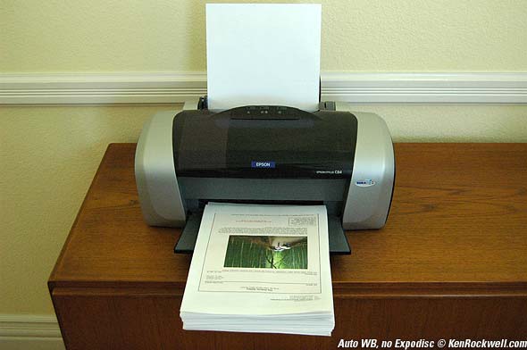 Indoors, daytime, no flash: This printer was lit by window light. That window light was coming from the sky and from my neighbor's green tree. Auto WB on my D200 rendered it too cool and green. Setting WB with the Expodisc (mouse over) made it look like it did to my eye, which took out green. I probably could have cheated and set WB from white paper with similar results.