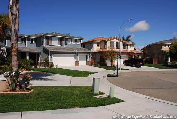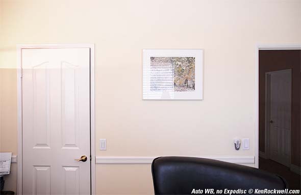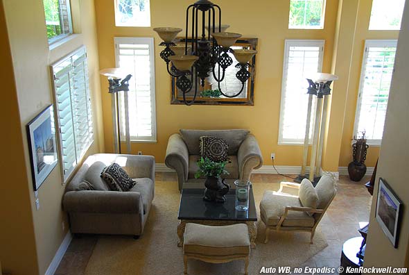 Indoors, daytime, some sunlight, no flash. This is a tough scene to balance. The light comes from every possible source except the sun or sky. The light is coming mostly from bouncing off the outside greenery, or bouncing off the walls or furniture. The AUTO WB version looks OK, but not like the scene did to my eye. This home has a marvelous, radiant warm color on the walls. Using the Expodisc I got the second image (roll your mouse over it to see) which matches this home. I'm impressed! There is no white in this scene onto which the auto WB can lock. Of course I had to walk down the stairs, set the WB with the Expodisc, and walk back up to make the photo. Once set for the scene I can make as many images as I want, and even change lenses, without having to repeat.