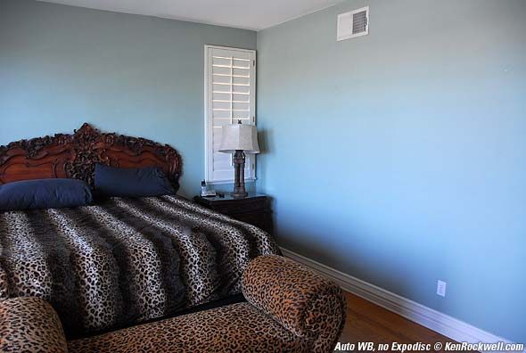 Indoors, daytime, no sunlight, no flash. The first shot looks fine and the whites are nice and clean, even without using the Expodisc to set the WB. The only problem is that the walls are green, not blue! Lo and behold, using the Expodisc to set WB matched what I saw. (move your mouse over the image to see the Expodisc version.) The light is coming through a balcony window to the left. The light source is the sky, and light reflected from a dark tan patio below. You can see this, in reverse, on the right wall, almost like a camera obscura. The bottom is brighter and bluer, lit from the sky, and the top is darker and tanner, lit by the reflection from the patio.