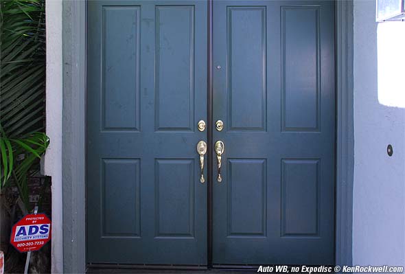 Weird (but typical) combination of shade, skylight, bushlight and reflected daylight. Auto WB gave a cool image. The Expodisc (mouse over the image) made it look as it did to my eye. This door is green, and so are the walls. In this case the WB with the expodisc restored the green.
