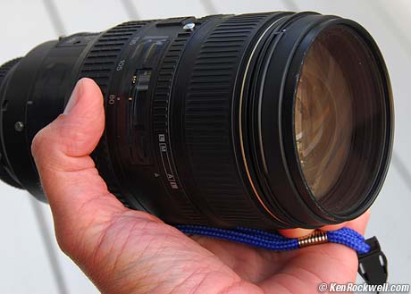 Expodisc Comes with clever neck strap. Get it here or here (comes in other sizes, too) INTRODUCTION The Expodisc is used in place of a white card to set manual white balance. It looks like a fat filter with a fluorescent light fixture diffuser on top and white plastic on the bottom. It costs about $120. You don't photograph through it. You put it over your lens and put your camera in the same position as your subject. Point the camera back to your shooting position. Set the camera's white balance while it measures the same light that will fall on the subject. Once set, put away the Expodisc and shoot from your original position. You don't shoot through the Expodisc, except to set the WB. It turns your camera into an incident meter. Incident meters measure the light falling on (incident to) the subject. They don't measure light reflected from the subject, as most meters do. Better than a flat white or gray card, the Expodisc lets you measure and compensate for light coming from all angles. A white card is directional and is best for copying flat art. An Expodisc is much better for three-dimensional subjects. I use it to set white balance in weird light. It also can be used to set manual exposure as an incident meter. Incident metering isn't affected by the lightness or darkness of the subject. Naked lens. Roll your mouse over the image to see how to mount the Expodisc. Unlike a filter, you don't have to screw it on or off. It press-fits inside the filter threads. It's easy to pop on and off. It's not as delicate as a filter and doesn't care much if it gets scratched or dirty. Feel free to jam it in your pocket naked. I keep mine in my filter wallet.