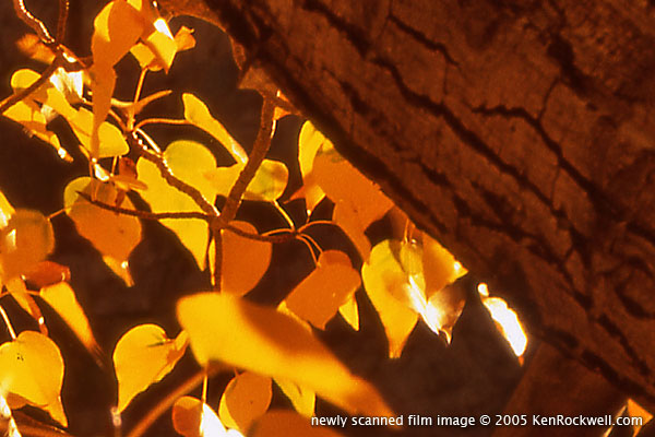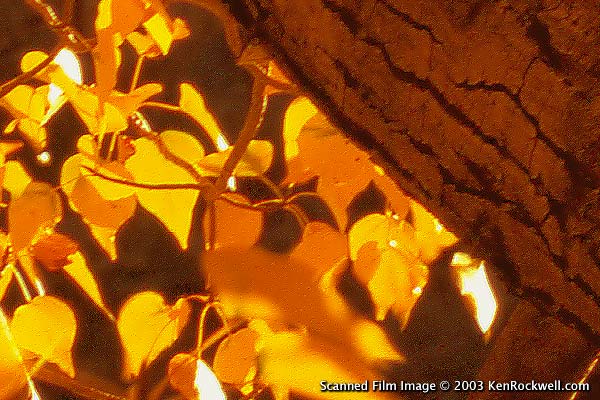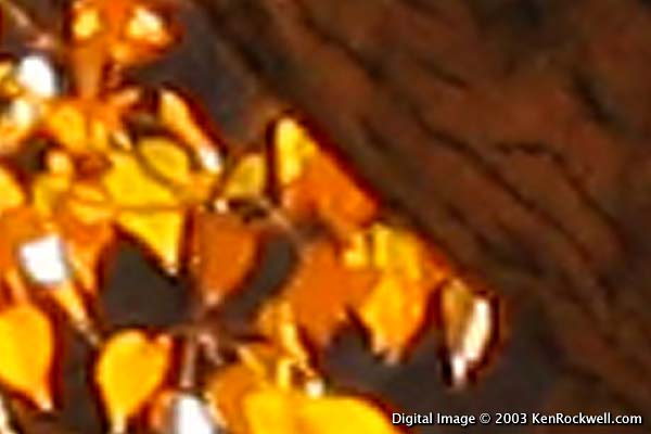 Crop from Digital Camera Image The digital camera photo looks like crud! How can this be? This is why professional landscape shooters shoot 4 x 5" film, even in 2005. Just read Outdoor Photographer's August 2005 annual landscape issue where they profile prominent shooters. The film was scanned at just 1800 DPI and the digital image rescaled to match exactly for a fair and balanced comparison. As enlarged here on your computer's 100 DPI screen the full images would both print at 60 x 80." They'd print at 20 x 24" at print's usual 300 DPI. The wind was blowing so some of the leaves are in different positions, not that you even can see them in the digital image. For the film image I used the cheapest landscape camera there is, a $700 4 x 5" Tachihara and my 50 year old Schneider Symmar 150 mm f/5.6 Convertible lens with a huge dent in the lens barrel and ordinary Fuji Velvia film. This camera is very popular with landscape photographers due to its low cost, light weight and flexibility. The 150mm lens is normal for a 4 x 5" camera. This image was scanned on a cheap consumer $500 flatbed scanner, the EPSON 4990, at 1,800 DPI, which doesn't even give you all the film's detail. If I really wanted to reproduce the film's sharpness I'd have it scanned at 5,000 DPI on a professional $100,000 Heidelberg. There's more detail on the film than you can see here. It would be a fairer test to have a real drum scan made, but I'm too cheap to send it out for scanning since the point is pretty obvious even at 1,800 DPI. The digital camera image is the same crop from a brand-new multi-megapixel digital camera made by the same company that keeps paying some bad-science photography websites to pimp it as being better than film. Here are examples of what's actually on film compared to how little scanners can see today.