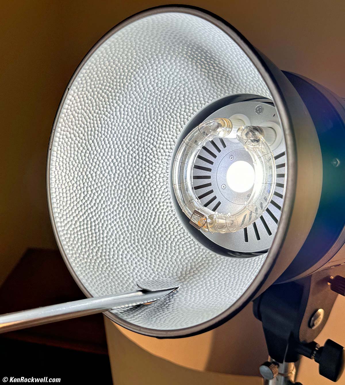Use with Umbrellas & ReflectorsI use a reflector with my umbrellas to throw the light into my umbrella rather than have it fly around the studio and pick up off-colors from my clothes or anything else if I just left the flash tube bare. To poke the umbrella shaft into the screw-locked receptacle under the strobe (above the tilt adjustment), mount the reflector with its punched-out section towards the bottom as shown, and poke-out the punched-out section to allow the shaft to penetrate the reflector: Punched-Out Slot for an Umbrella in the included Reflector. bigger.
