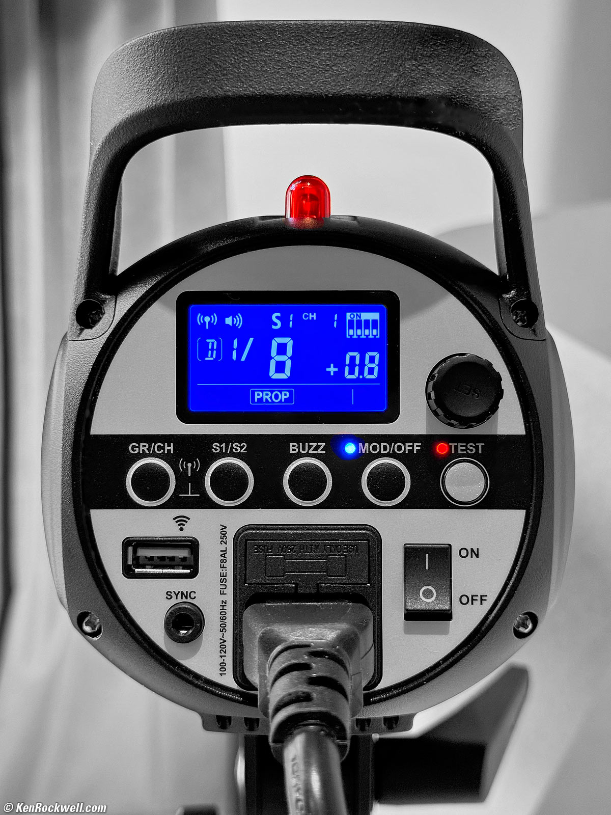MOD/OFFTap this to turn off the modeling light, or turn it on full-power or proportional modes. The bottom of the LCD will show OFF, PROP (proportional to the strobe setting) or 100%. When it shows a percentage, press-in the knob at the top right to set a particular percentage value, or just leave it at 100%. Tap the knob again to lock-in the setting. Easy.