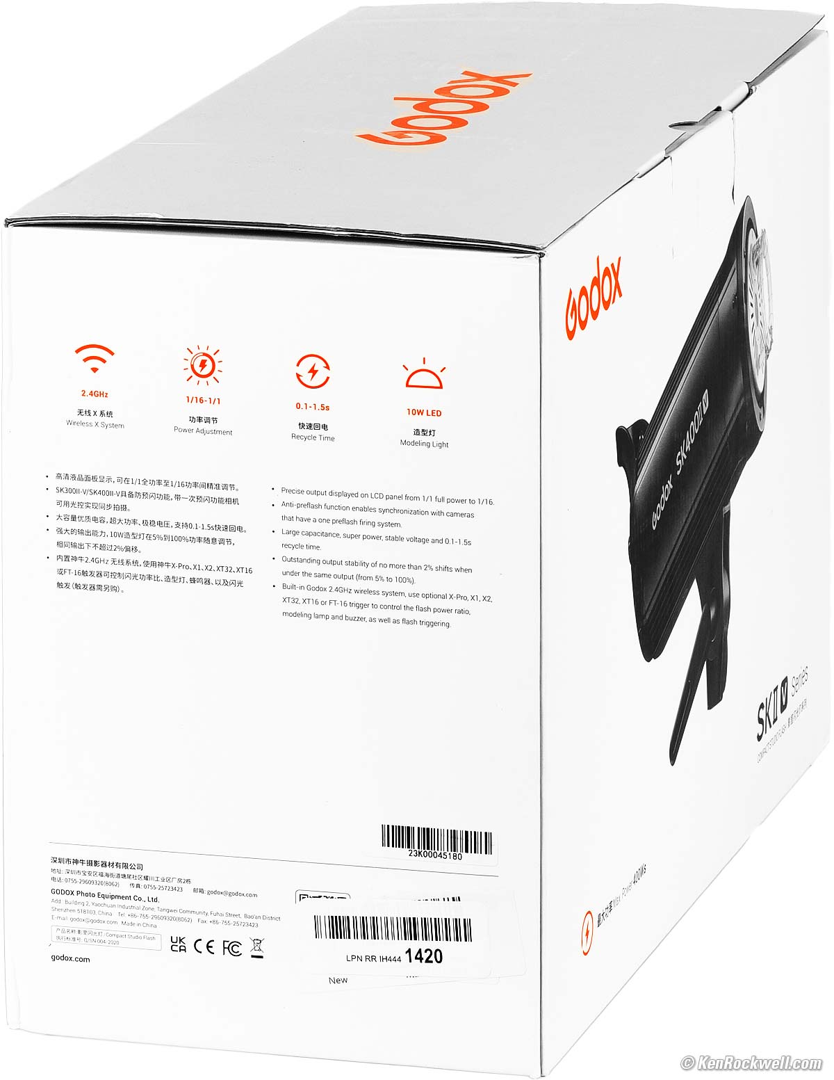 Packaging specifications topMolded closed-cell polystyrene foam holding the parts inside a corrugated cardboard box: Box, Godox SK400 II V Studio Strobe. bigger.
