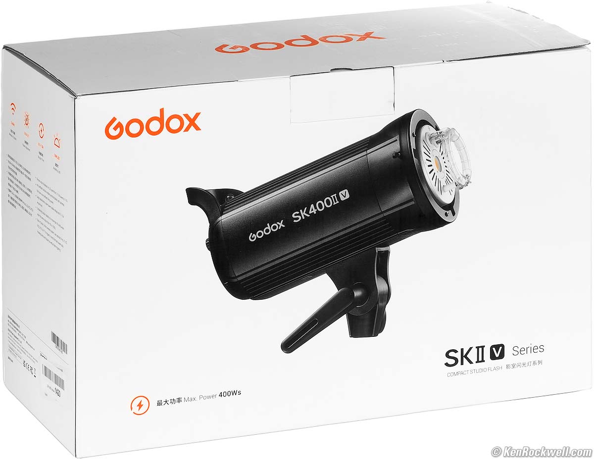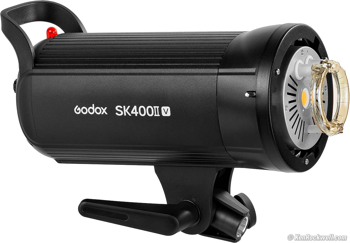 Godox SK400II V400 Ws 2.4 GHz, Optical & Wired Xenon Strobe, with Standard Bowens S Accessory MountSample Images Intro New Good Bad Missing Specs Accessories Measurements Compared User's Guide Recommendations More Godox SK400 II V Studio Strobe with included reflector (400 Watt-seconds maximum output with a 1.0 second measured recycling time, runs on AC power, manual [no TTL] 1 ~ 1/16 power settings in tenths of stops [equal to 400 Ws ~ 25 Ws], mounts on standard ⅝" light stands with enough set screw travel to work on ⅜" light stands as well, 4.63 lbs/74.1 oz./2,100g, $169). bigger. I'd get mine at Amazon, which includes the reflector as shown. I'd also get it as part of a multi-light kit at B&H or at Adorama, or at eBay (How to Win at eBay). It also comes without the reflector at B&H and you can order the standard reflector separately, as well as loads of other reflectors, softboxes, snoots and more that all fit its standard Bowens S mount. This all-content, junk-free website's biggest source of support is when you use those or any of these links to approved sources when you get anything, regardless of the country in which you live. Thanks for helping me help you! Ken.