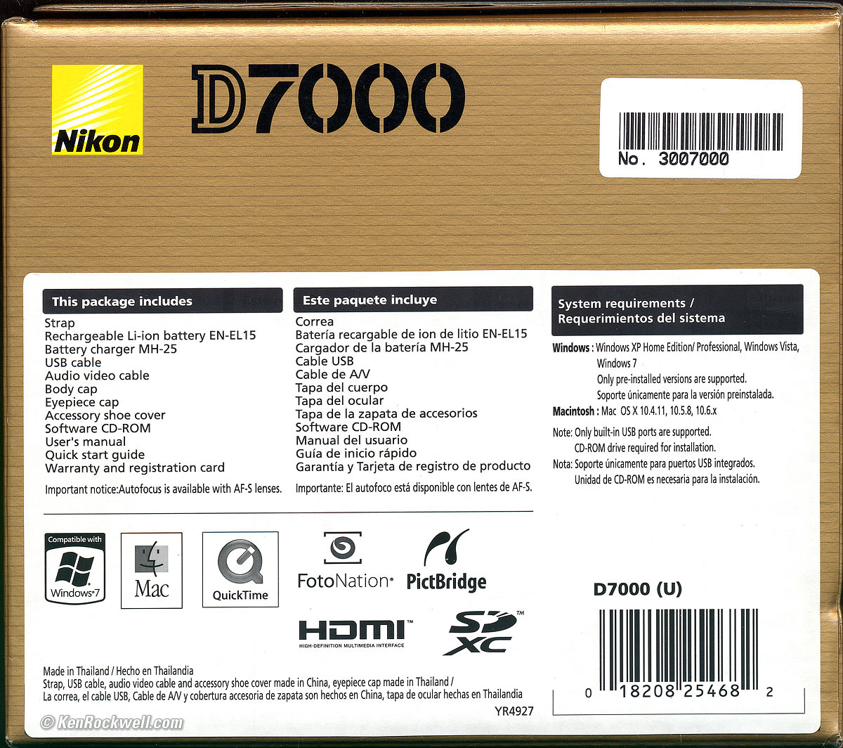 Nikon Camera Warranty Identification top Nikon D7000 box. bigger. As of 2010, Nikon sometimes marks the boxes of USA products with a (U) after the product name, seen above the UPC on the lower right. (E), (EP) or (UK) means you got screwed; those are for other markets. If you're in the USA, return anything marked this way immediately; you have NO WARRANTY from Nikon USA if you need help or service, and with digital cameras, you will need service, or at least firmware updates, in the future. (UK) is for the UK. When you open your D7000, the plastic bag holding your two fat, printed users manuals (one in English and one in Spanish) should have a "U-S" (or "U-K" for the kit with lens) sticker on it. This tells the packers in Thailand that this is the manual set for the US version.