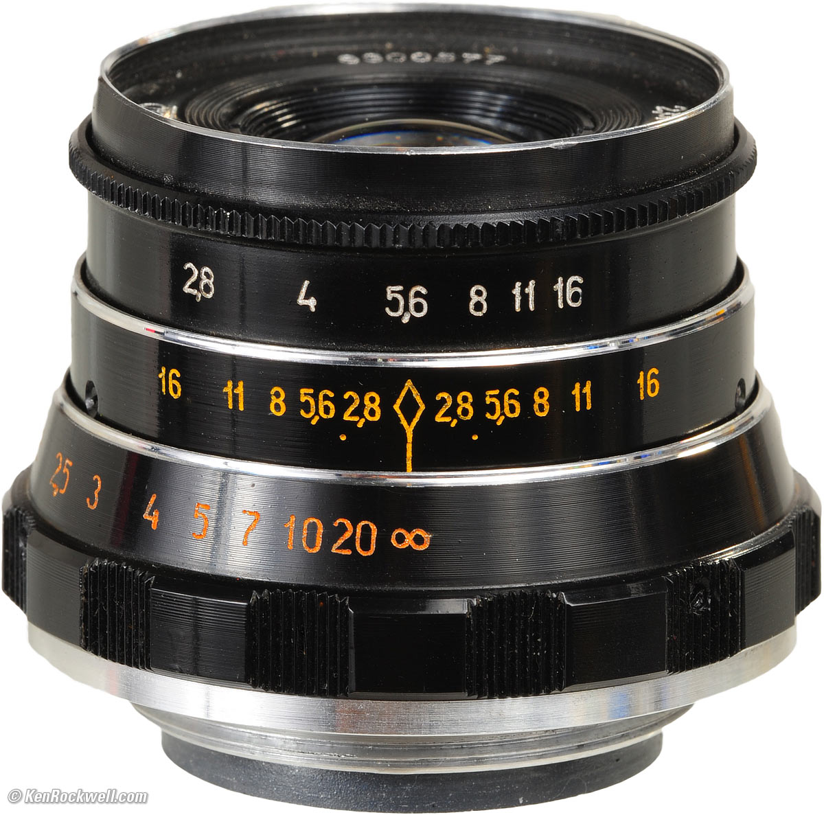 This Industar 55mm f/2.8 comes from the Arsenal factory in Ukraine. It's still made today, and has been made since at least the early 1970s. This sample is from about 1983, as the first two digits of the serial number record. Used correctly, it can create vivid, jaw-dropping, award-winning images worthy of space in the world's finest art galleries. On the test bench, it's inferior to LEICA and LEITZ lenses, but since no one has ever created a remarkable photo of test benches, who cares? An advantage of this Industar lens over LEICA is its very light weight: just 129.7g (4.575 oz.). It's made entirely of the space-age wonder metal, aluminum. LEICA's recent 50/2.8 ELMAR-M (1994-2007) and traditional 50mm f/2.8 ELMAR (1957-1974) weigh much more due to their use of primitive brass. LEICA's original LEITZ 50mm f/3.5 ELMAR (1925-1961) weighs even less, at 111.2g (3.920 oz.) and has similar performance to this Industar. The LEITZ f/3.5 lens has less distortion, but it's 2/3 stop slower, and has poorer ergonomics and a higher price.