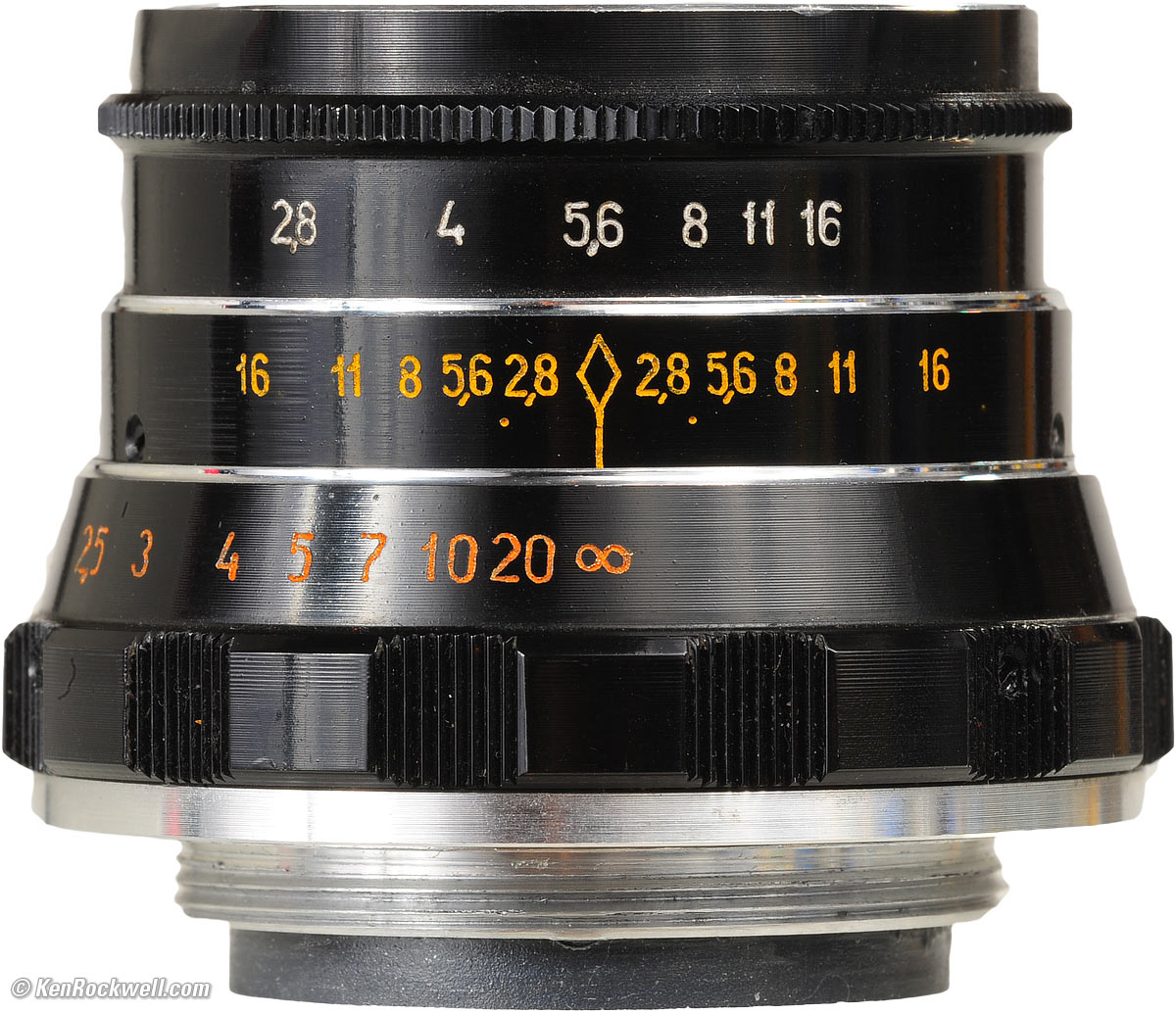 Ergonomics top Industar 55mm f/2.8. bigger. The Industar 55mm f/2.8 handles great. It's easy to focus and to adjust the aperture. Focus is geared just right: it turns from infinity to 1 meter in about 100.º Focus is undamped and a bit loose. The big ring near the camera turns easily. Because the focus ring is close to the camera, you may feel the unlocking button or the delayed-release or preselector lever of your camera as you focus, but it's no problem.