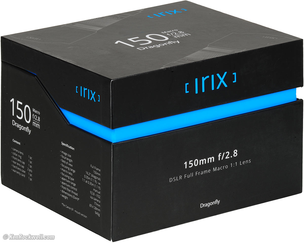 Irix 150mm f/2.8Manual-Focus 1:1 MacroCompatibility Specs Performance Irix 150mm f/2.8 Macro, Nikon F version. (manual-focus only, metal 77mm filter thread, 29.2 oz./828g, 1:1 macro, 1.14'/0.345m close focus, about $595). bigger. I'd get mine at Adorama, at Amazon or at B&H. It comes in mounts for Nikon F, for Canon EF and for Pentax K. This 100% all-content, junk-free website's biggest source of support is when you use those or any of these links to my personally-approved sources when you get anything, regardless of the country in which you live. Get yours only from the trusted sources I've used personally for decades for the best prices, service, return policies and selection. Thanks for helping me help you! Ken.
