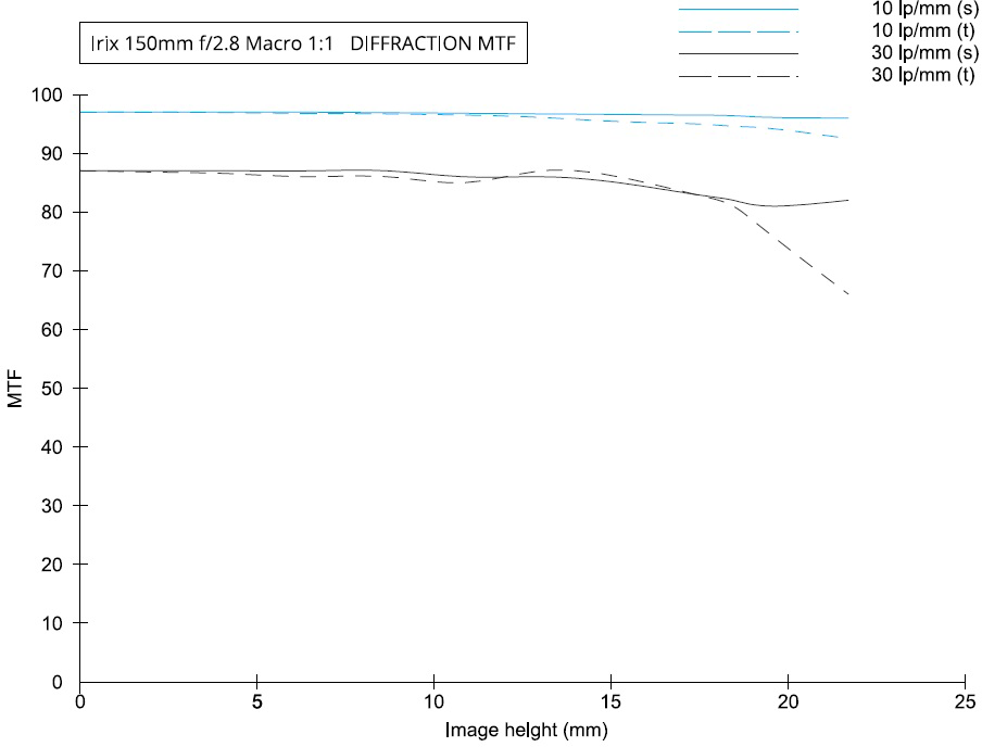 SharpnessLens sharpness has nothing to do with picture sharpness; every lens made in the past 100 years is more than sharp enough to make super-sharp pictures if you know what you're doing. The only limitation to picture sharpness is your skill as a photographer. Only the least talented people spend the most time worrying about lens sharpness. Skilled photographers make great images with whatever camera is in their hands; I've made some of my best images of all time with an irreparably broken camera! Most pixels are thrown away before you see them, but camera makers don't want you to know that. If you're not getting ultra-sharp pictures with this, be sure not to shoot at f/11 or smaller where all lenses are softer due to diffraction, always shoot at ISO 100 because cameras become softer at ISO 200 and above, avoid shooting across long distances over land which can lead to atmospheric heat shimmer, be sure everything is in perfect focus, set your camera's sharpening as you want it (I set mine to the maximum) and be sure nothing is moving, either camera or subject. If you want to ensure a soft image with any lens, shoot at f/16 at ISO 1,600 at default sharpening in daylight through heat shimmer of rapidly moving subjects at differing distances in the same image. The great news is that, as we expect with all macro lenses, it's ultra-sharp corner-to-corner, even wide-open at f/2.8. This lens is ultra-sharp, but actually getting something in perfect manual focus is another issue due to the tiny depth of field all lenses have at close distances. The imprecise manual focus action makes it difficult to set exact focus when on a tripod at large apertures. Forget hand-holding at large apertures at close distances; your breathing will move the camera enough to put it out of focus! Here's a calculated (not measured) MTF chart: Irix 150/2.8 calculated MTF. bigger.