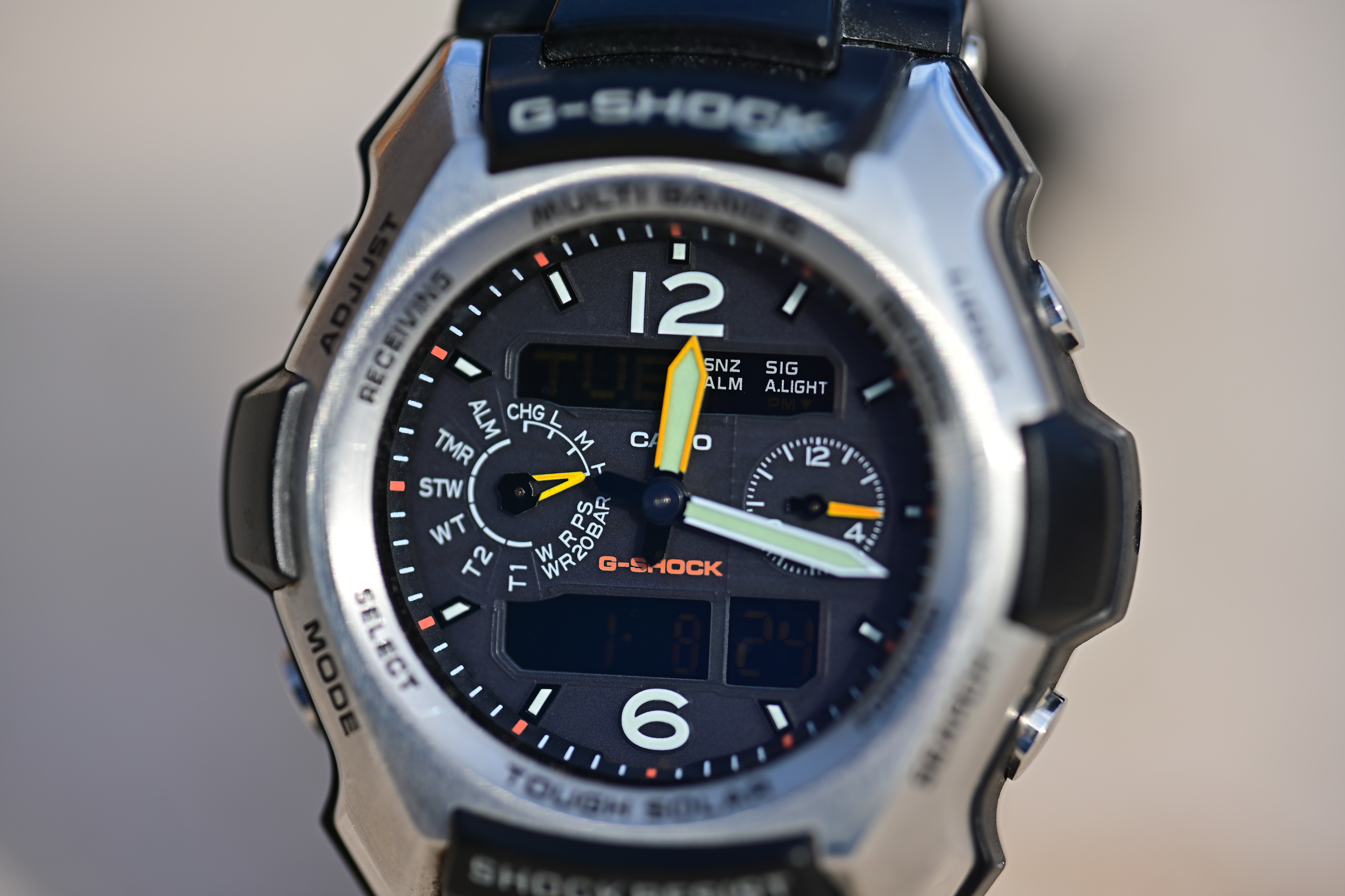 Macro PerformanceMacro performance is great; it focuses up to 1:1, life-size on the sensor: Casio G-Shock Solar Atomic Watch, 08 January 2019. bigger or camera-original © file. The sample is shot at f/2.8. The lens is marvelously sharp, but in actual practice you'll see that there is zero depth of field. Every element of the watch face is at a different distance and is out of focus. Good luck, this lens is essentially optically perfect, but at macro distances depth of field doesn't exist with any lens.