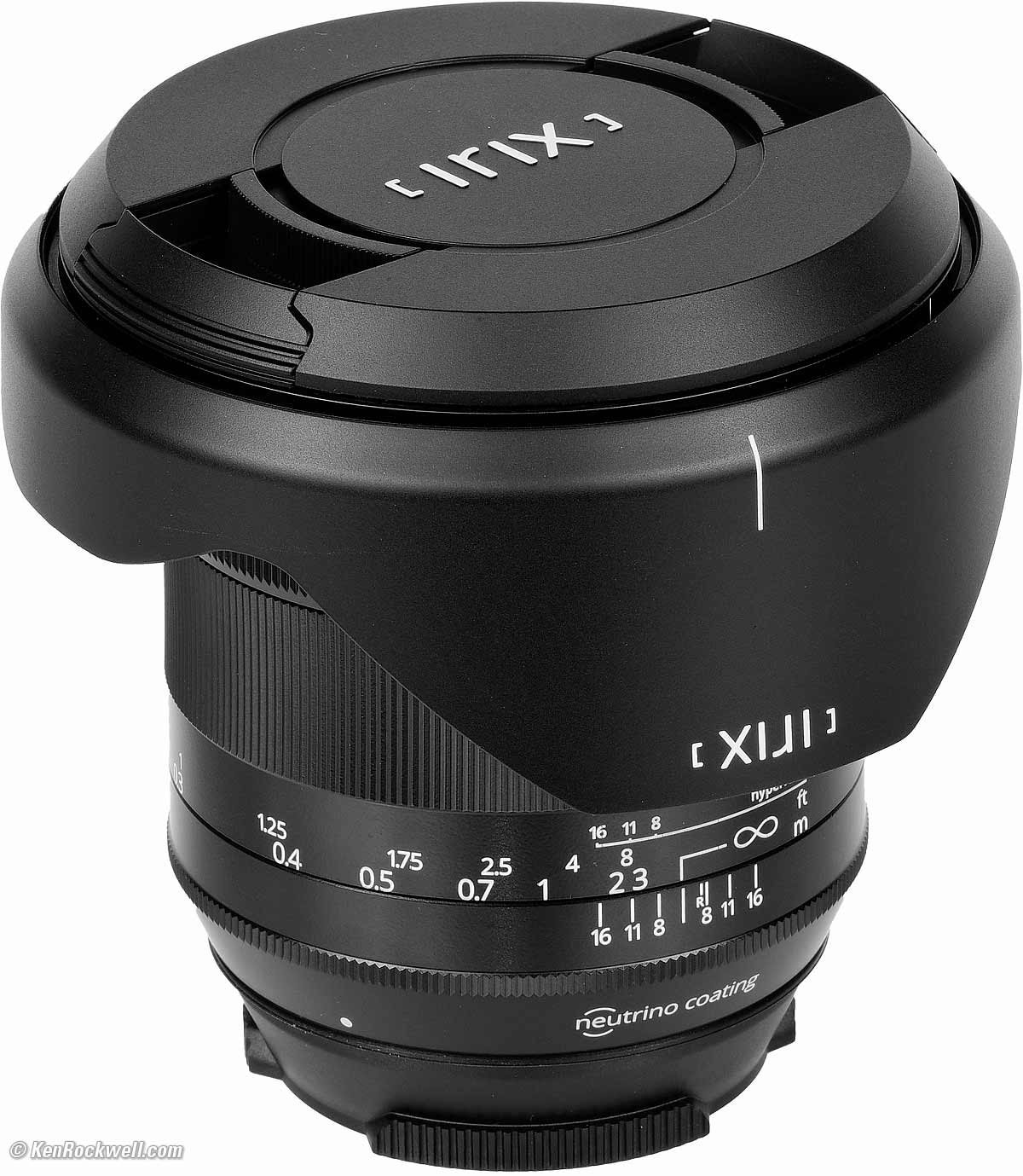 ErgonomicsIrix 15mm f/2.4, Blackstone version for Canon. bigger. This is a heavy metal lens. The focus ring is stiff, requiring a strong grasp to twist quickly. Yes, the focus ring grip is slightly curved. No big deal; it tends to keep your fingers from sliding forward or back off the fluting. There is also a focus lock ring, but I have no idea why you'd need it with focus as stiff as it is. It feels similar to the Zeiss 15mm f/2.8. The mounting index dot is a nearly invisible small grey dot; it should be a big red plastic blob you can feel in the dark — but no! The all-white markings would be much more useful if they were color-coded: red infra-red index, yellow footages, etc.