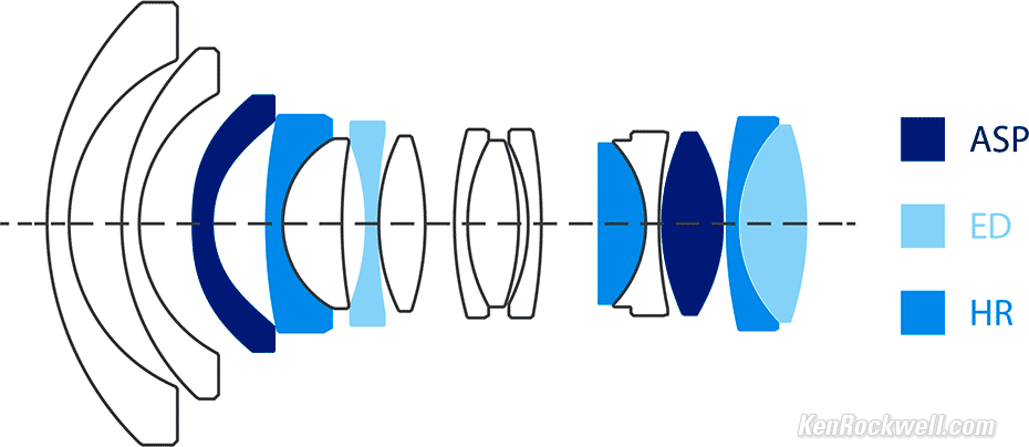 OpticsIrix 15mm f/2.4 Internal Optical Construction. bigger. 15 elements in 11 groups. 2 aspherical elements. 2 extra low dispersion elements. 3 high refractive-index elements. Multicoated; branded as "neutrino." Rear focussing.