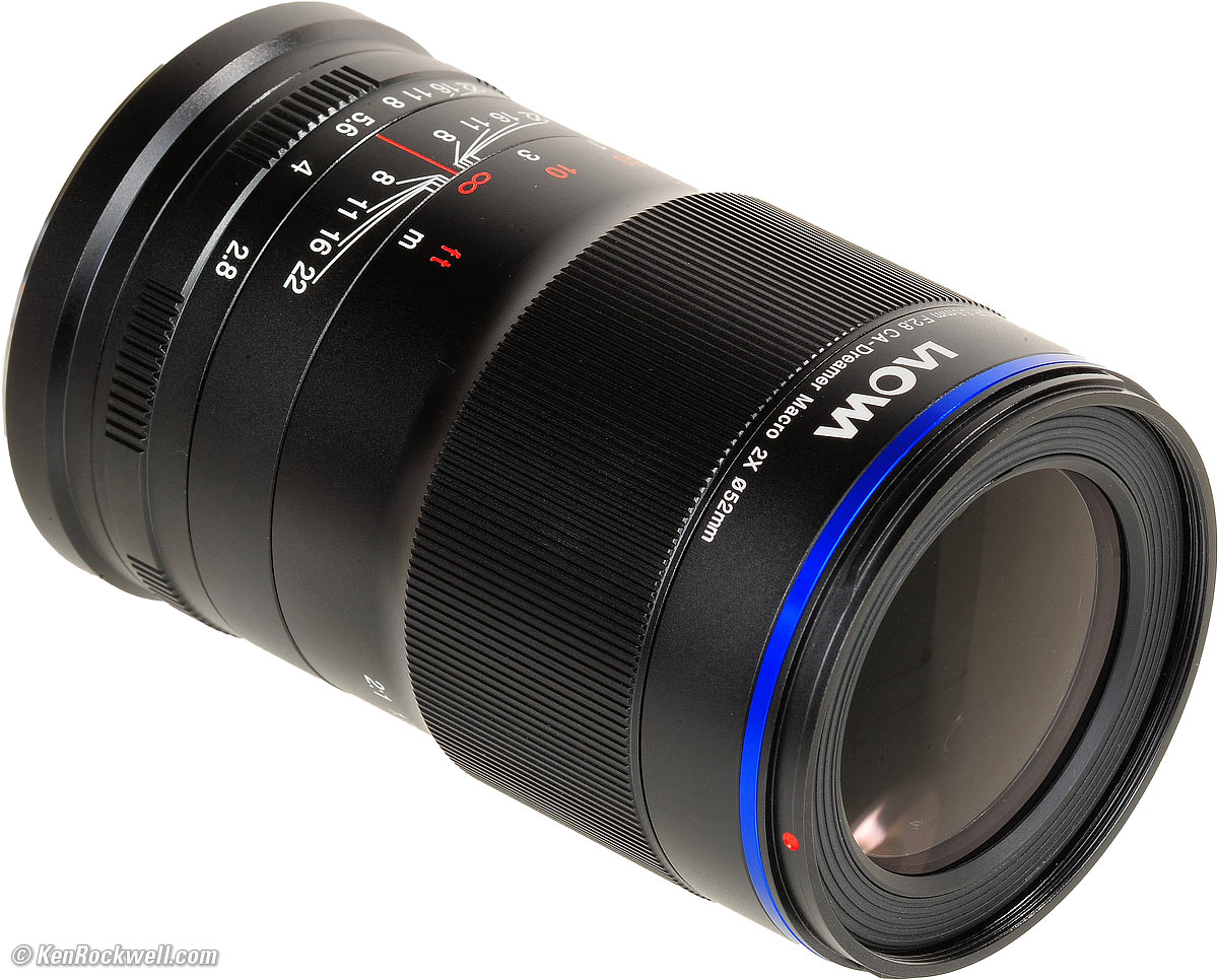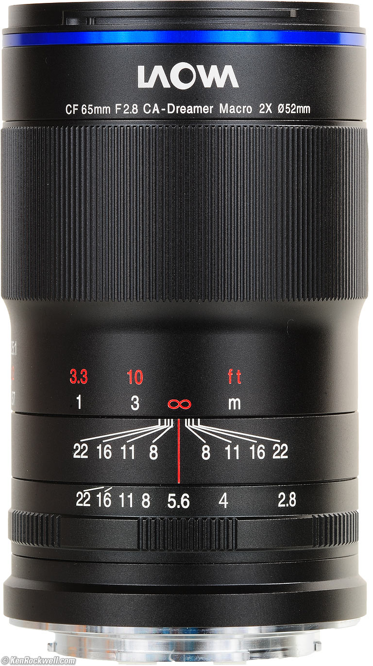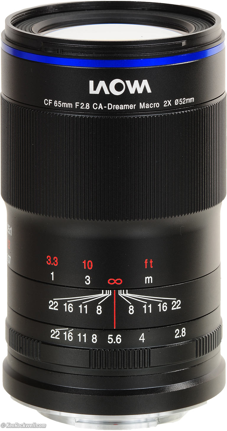 Recommendations topSample Images Intro Compatibility Specifications Performance Compared This is a unique lens for people who want to get ultra, ultra close and also shoot regular telephoto pictures with the same lens. Just know that it's a pain to use for hand-held photography due to its completely manual diaphragm. I use a clear (UV) protective filter instead of a cap so I'm always ready to shoot instantly. I only use a cap when I throw this in a bag with other gear without padding — which is never. The UV filter never gets in the way, and never gets lost, either. The very best protective filter is the Multicoated Hoya HD3 52mm UV which uses hardened glass and repels dirt and fingerprints. It's expensive, but it will last forever long after this lens is gone. For less money, the B+W 52mm 010 is an excellent filter, as are the multicoated B+W and the basic multicoated Hoya filters and the most basic Hoya multicoated filter, but the Hoya HD3 is the toughest and the best. Filters last a lifetime, so you may as well get the best. The Hoya HD3 stays cleaner than the others since it repels oil and dirt. All these filters are just as sharp and take the same pictures, the difference is how much abuse they'll take and stay clean and stay in one piece. I'd get my 65mm ultra-macro at Adorama for Sony, for Canon EOS-M or for Fuji X APS-C, or at B&H for Sony, for Canon EOS-M or for Fuji X APS-C, or eventually get it used at eBay if you know How to Win at eBay. This 100% all-content website's biggest source of support is when you use those or any of these links to approved sources when you get anything, regardless of the country in which you live. Laowa does not seal its boxes in any way, so never buy at retail or any other source not on my personally approved list since you'll have no way of knowing if you're missing accessories, getting a defective, damaged, returned, non-USA, store demo or used lens. I use the stores I do because they ship from secure remote warehouses where no one gets to touch your new camera before you do. Buy only from the approved sources I use myself for the best prices, service, return policies and selection. Thanks for helping me help you! Ken, Mrs. Rockwell, Ryan and Katie.
