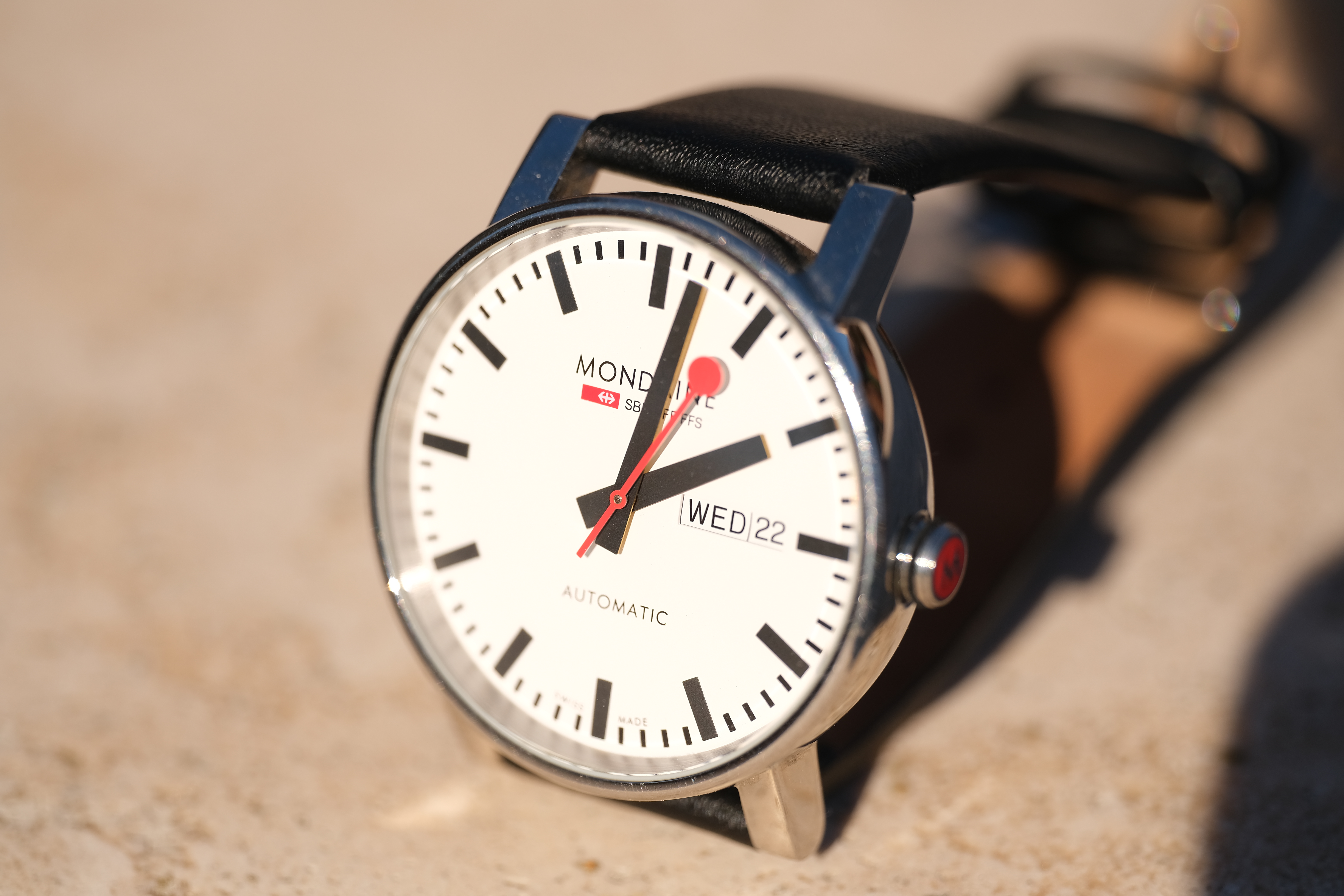 Spherochromatism performance topSpherochromatism, also called secondary spherical chromatic aberration, is an advanced form of spherical and chromatic aberration in a different dimension than lateral chromatic aberration. It happens in fast lenses when spherical aberration at the ends of the spectrum are corrected differently than the middle of the spectrum. Spherochromatism can cause colored fringes on out-of-focus highlights, usually seen as green fringes on backgrounds and magenta fringes on foregrounds. Spherochromatism is common in fast lenses of moderate focal length when shooting contrasty items at full aperture. It goes away as stopped down. This lens most wonderfully has no Spherochromatism, which is excellent performance: Mondaine A132.30348.11SBB at f/2.8, 22 January 2020. bigger or camera-original © file.