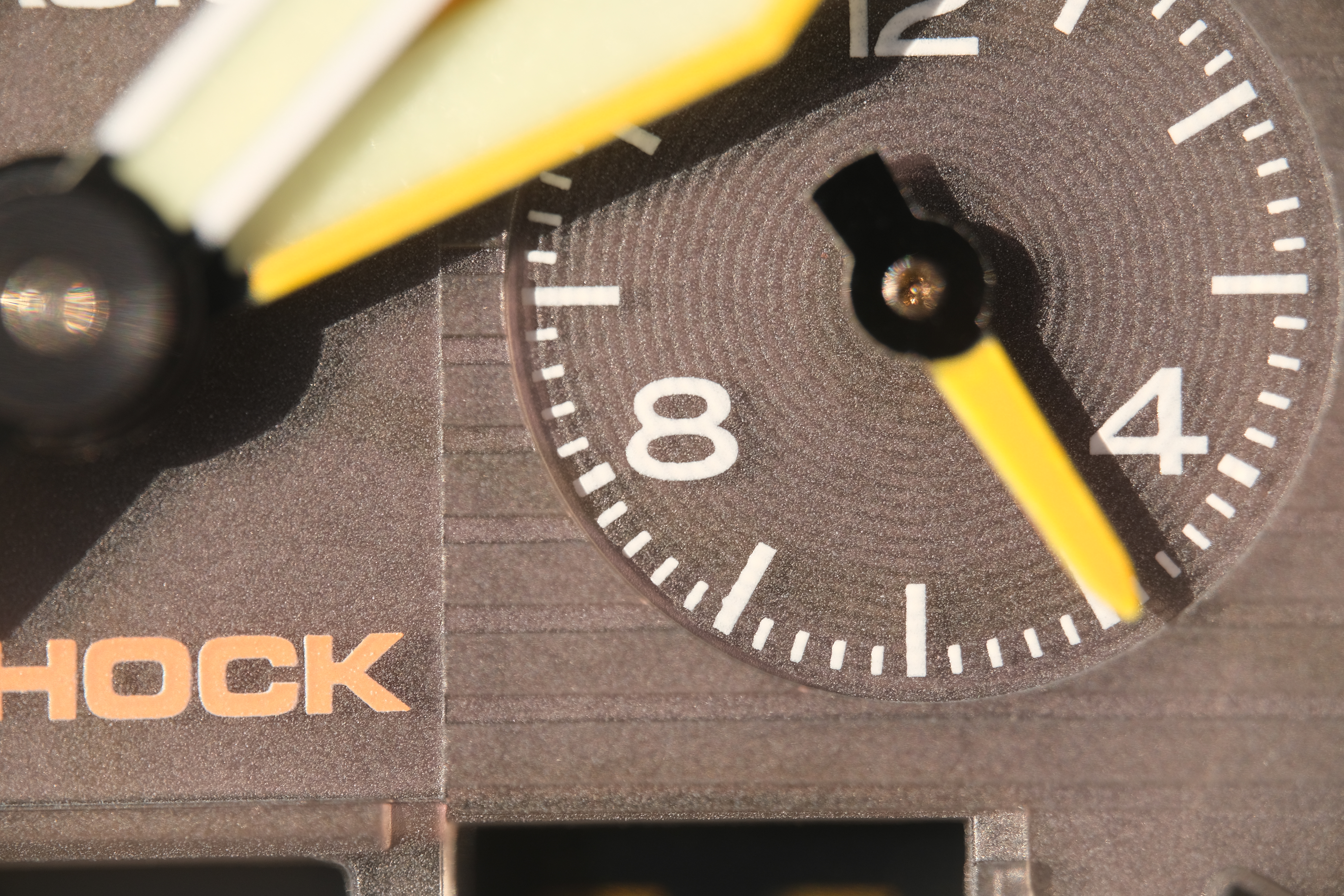 Macro Performance performance topObviously this lens is all about macro performance, getting twice as close as any other macro lens I've ever used. This isn't a crop; this is my full image which is covering a tiny 8x12mm (0.3 x 0.5 inch) bit of subject: Casio G-Shock Solar Atomic Watch wide-open at f/2.8 at close-focus distance at 1/350 at ISO 320, 22 January 2020. bigger or camera-original © file. Of course depth-of-field is completely nonexistent at this aperture and distance, even the tiniest variations in height and depth of this watch face put those sections completely out of focus, and of course the hands are even further out of focus. I'm hand-holding this shot, so it's not square to the watch face, either.