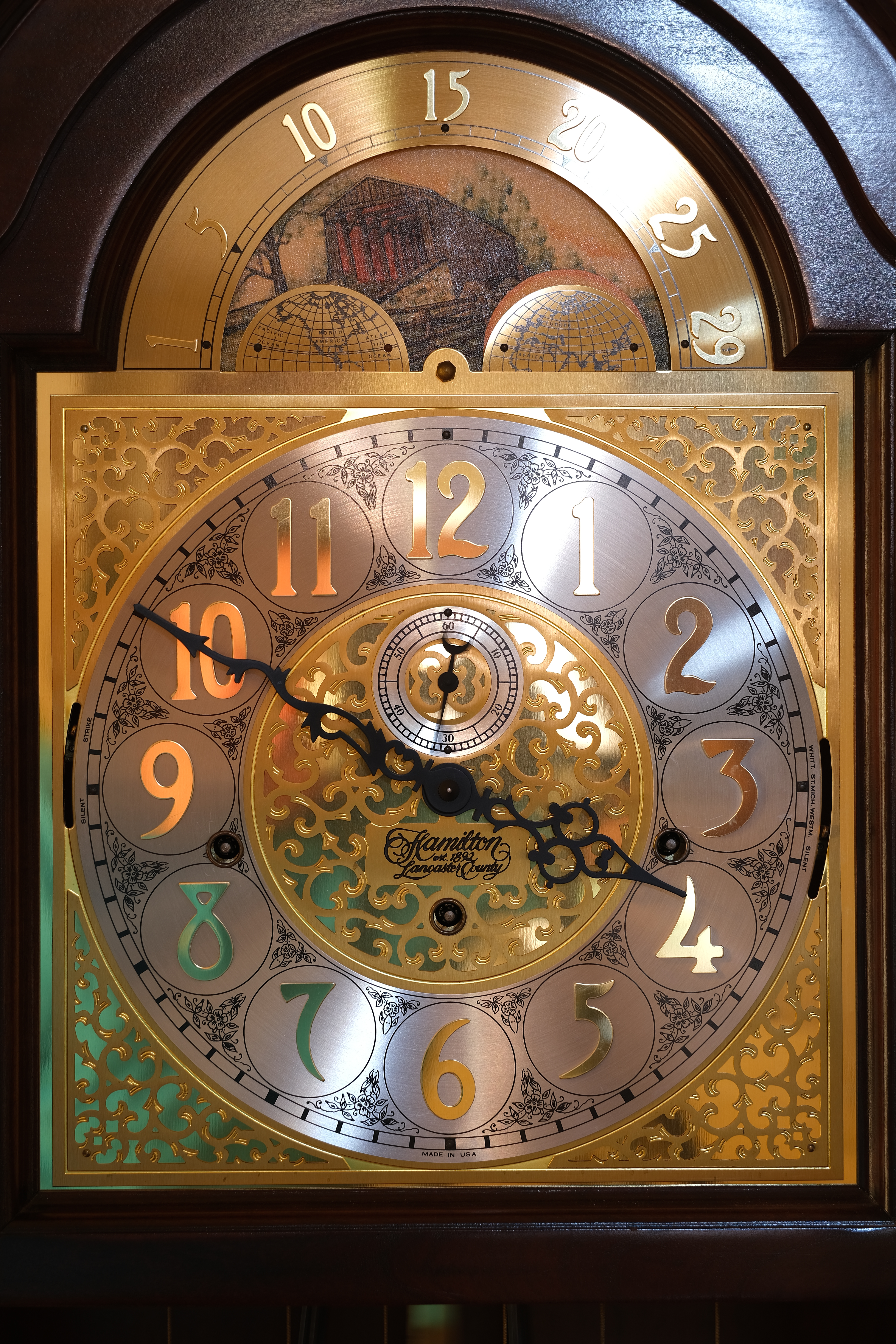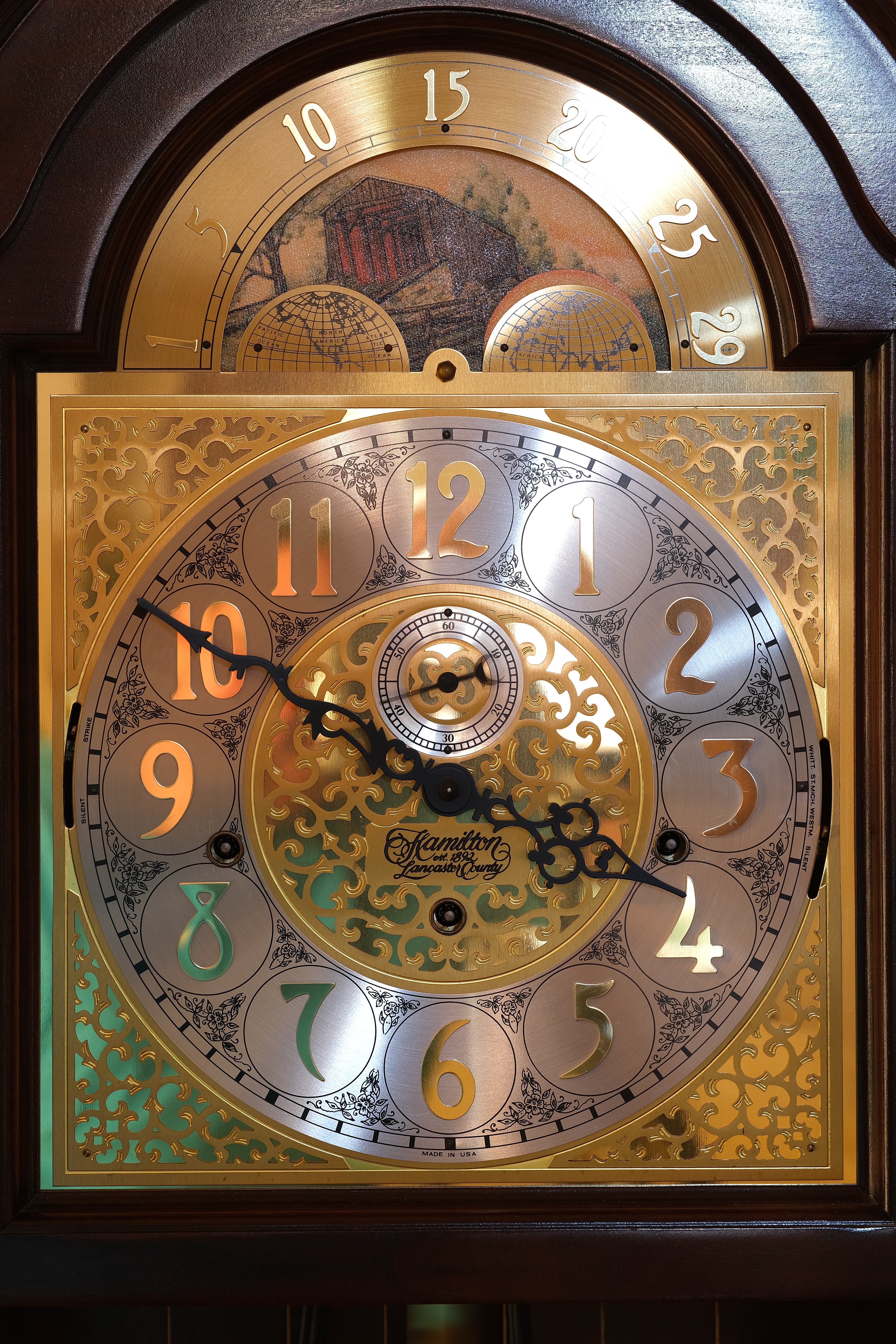 Hamilton Lancaster County Grandfather Clock, 22 January 2020. Fuji X-T30, Laowa 65mm f/2.8 2X Ultra-Macro at f/5.6 at 1.6 seconds at ISO 80. bigger or camera-original © file. Of course it's sharp at f/5.6 (remember the hands are moving in this time exposure); but what's awesome is how it's just as sharp wide-open at f/2.8: Hamilton Lancaster County Grandfather Clock, 22 January 2020. Fuji X-T30, Laowa 65mm f/2.8 2X Ultra-Macro at f/2.8 at 1/1.9 second at ISO 80. bigger or camera-original © file. The second hand is still moving.