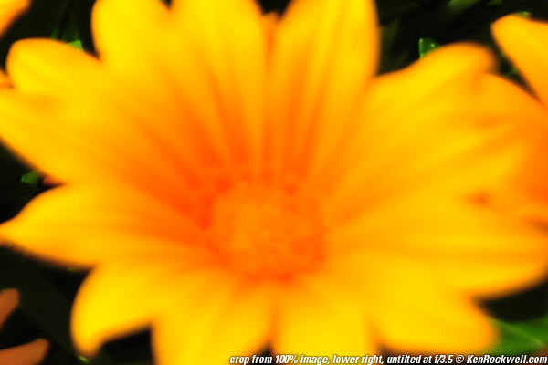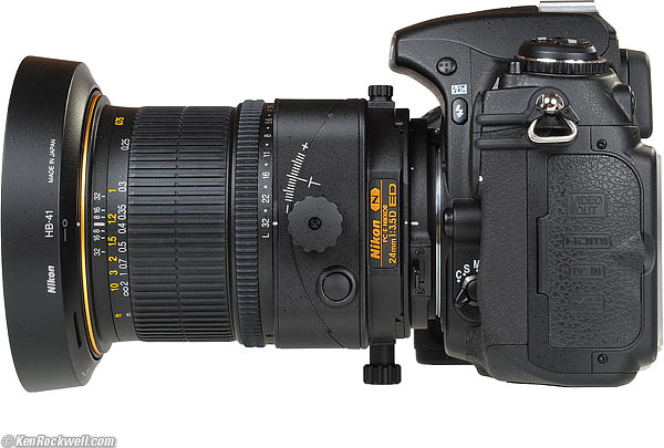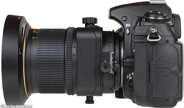 View Camera Movements: April 2008 These tricks apply to every view camera, and to special tilt-shift and perspective control lenses made by Canon and Nikon. Nikkor 24mm PC-E at f/3.5. Roll mouse over to see effects of forward tilt. See how I got everything perfectly sharp, wide open, just by tilting the lens? I was only inches from the closest flower! In case you didn't see it above, here are crops from 100% images, which would print 40" (110cm) wide at this magnification: Crop from 40" (1.1m) print. Roll mouse over to see effects of forward tilt. This was not stopping down! Your depth-of-field is irrelevant, because you can tilt your field to be any flat plane you desire. In this case, I swung the lens down to make the plane of the flowers the plane of best focus. Roll your mouse over to see the lens swing down 8.5 degrees. On a view camera, simply tilt the lens board forward, or the rear film holder backwards. How Tilt Works Lenses give perfect focus in one flat plane. Lenses that don't tilt only give perfect focus in a plane parallel to the film or sensor. When a lens is swung or tilted, we also swing or tilt the plane in which we have perfect focus. I can shoot at any large aperture and everything in a plane is in focus. If it's windy I can use a fast shutter speed, and the larger apertures eliminate any sensor dust. The only limitation is that the best focus is still along a flat plane, so some depth of field is still needed if a flower or the top of a glass on a table-top pops above the main plane of focus. Even with an errant object above or below that plane, it's still much less of a problem than needing depth of field to bring everything into focus. Tilt lenses are easy to adjust: just tilt forward until it's all sharp in the finder. Since every lens on a 4x5" camera is a tilt lens, that's one of the reasons landscapes shot on 4x5" can have such insanely perfect near-far focus. You can't duplicate this in Photoshop. Out of focus images remain out of focus. How to Use Tilt: Easy! 1.) Set all the lens (or view camera) settings to their zero, or neutral positions. This keeps you from going crazy in the next step. 2.) Set up the camera and frame your photo. 3.) If using an SLR lens like the Canon or Nikon, be sure to measure your exposure and hit the AE lock (or use manual exposure) before you make any movements. 4.) Tilt or swing the lens until everything is in focus. You'll usually have to play with the focus as you do the tilting. Swing the lens towards the same plane as your subject. If you have a field, tilt the lens down. If you want to bring an entire wall into focus, swing the lens towards the wall. 5.) Tilt, framing and focus adjustments usually interact. Keep moving everything little by little and you'll get there fast.