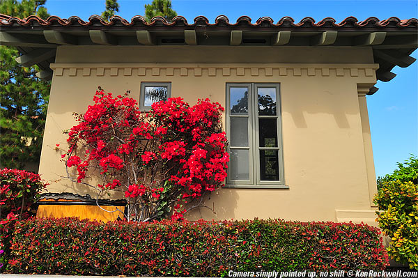 Camera horizontal with no lens shift. How to Use Shift: Easy! 1.) Set all the lens (or view camera) settings to their zero, or neutral positions. 2.) Set up the camera and make it level. In the shot above, I'm holding it only inches above the patio. 3.) If using an SLR lens like the Canon or Nikon, be sure to measure your exposure and hit the AE lock (or use manual exposure) before you make any movements. 4.) Look through the finder or ground glass, and move the lens up and down, left or right, to frame your subject. It's easy: move the lens in the direction you need to look. In the example above, obviously you need to move the lens up. Easy!