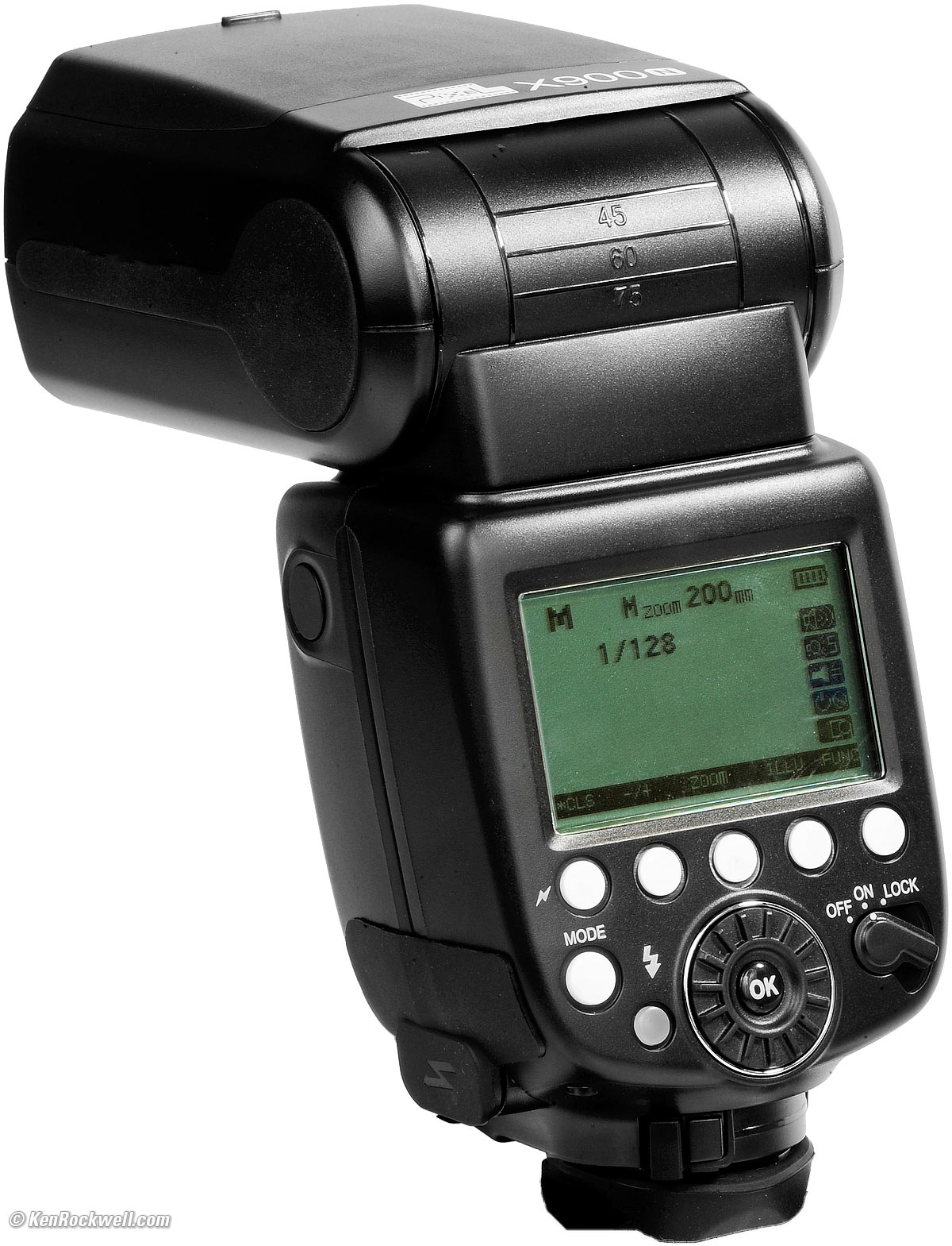 RecommendationsTop Intro Specifications Accessories Performance User's Guide Recommendations This cheap flash works surprisingly well, with all the features of the top radio-controlled flashes from Canon and Nikon, and its big included battery lets it shoot more shots faster than either Nikon or Canon's flashes can. The big Li-Ion battery doesn't get as hot as AA Ni-MH do during heavy shooting, and recycles at least as fast. If you only use your flash on-camera or don't need radio control and want a low price, it's better to buy a used Canon 580EX II or a used Nikon SB-700 to get higher quality at about the same price (580EX II review and SB-700 review.) Both this flash and camera-brand flash respond to the camera-makers' optical control systems. However, if you need the latest radio-control features for off-camera flash and your only other option are the $600 flash and triggers, consider these. The radio-control features on this flash don't work with Nikon's or Canon's radio triggers, they work with the less expensive Pixel King Pro Radio Trigger instead. This 100% all-content website's biggest source of support is when you use those or any of these links to approved sources when you get anything, regardless of the country in which you live. Buy only from the approved sources I use myself for the best prices, service, return policies and selection. Thanks for helping me help you! Ken, Mrs. Rockwell, Ryan and Katie.