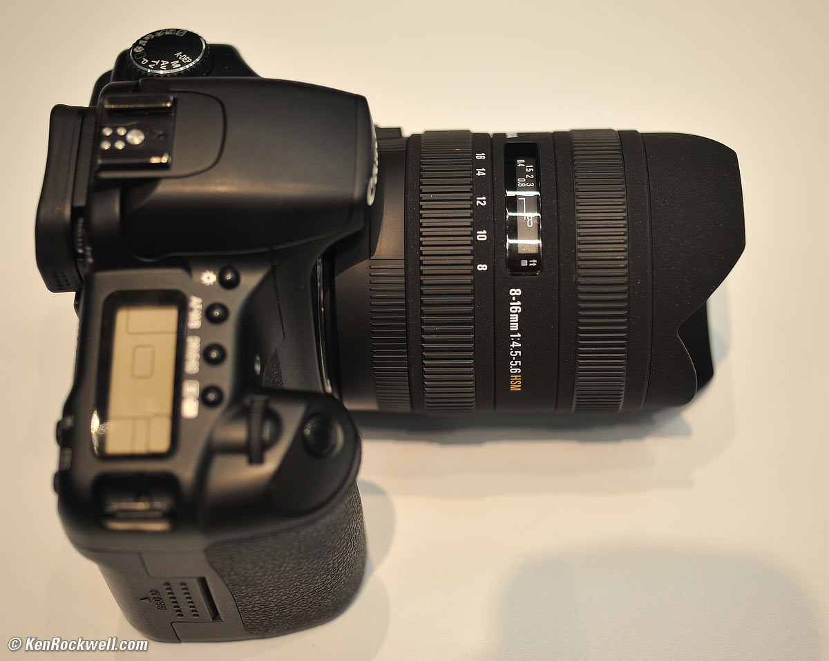 Sigma top Sigma 8-16mm non-distorting DX ultrawide! Sigma 8-16mm ultrawide. bigger. Sigma just announced the world's widest non-distorting lens for DX and 1.6x Canon cameras, an 8-16mm f/4.5-5.6. Whoo hoo! This is not a fisheye: straight lines stay straight! It feels like most of Sigma's more expensive lenses: ugly paint, and smoother than average (for Sigma) zoom and focus controls. It gives an equivalent angle-of-view to what a 12-24mm lens sees on film or full-frame. It is a lot smaller than Sigma's 12-24mm full-frame lens, and as slow (dark) as the 12-24mm full-frame. This lens is wider than anything from Nikon or Canon that doesn't distort for little digital SLRs. Whoo hoo! Sigma calls this the 8-16mm F4.5-5.6 DC HSM. Sigma's PR says "The Sigma 8-16mm F4.5-5.6 DC HSM is the first ultra-wide zoom lens with a minimum focal length of 8mm, designed specifically for APS-C size image sensors. This lens has an equivalent angle of view of a 12-24mm lens when used on digital cameras with an APS-C size image sensor. The wide-angle of view from 121.2 degrees* produces striking images with exaggerated perspective, enabling photographers to emphasize the subject. Four FLD glass elements, which have the performance equal to fluorite glass, compensate for color aberration. One hybrid aspherical lens and two glass mold elements give excellent correction for distortion and astigmatism. Incorporating an inner focusing system, the lens produces high-definition images throughout the entire zoom range. The Super Multi-Layer Coating reduces flare and ghosting while superior peripheral brightness ensures high contrast images throughout the entire zoom range. This lens incorporates Hyper Sonic Motor (HSM), ensuring quiet and high speed auto focus, as well as full-time manual focus capability. It has a minimum focusing distance of 9.4 inches throughout the entire zoom range, which allows photographers to emphasize the subject by creating exaggerated perspectives. This lens has a compact construction with an overall length of 4.2 inches and a maximum diameter of 2.9 inches." Sigma 8-16mm on a Canon. Bigger.