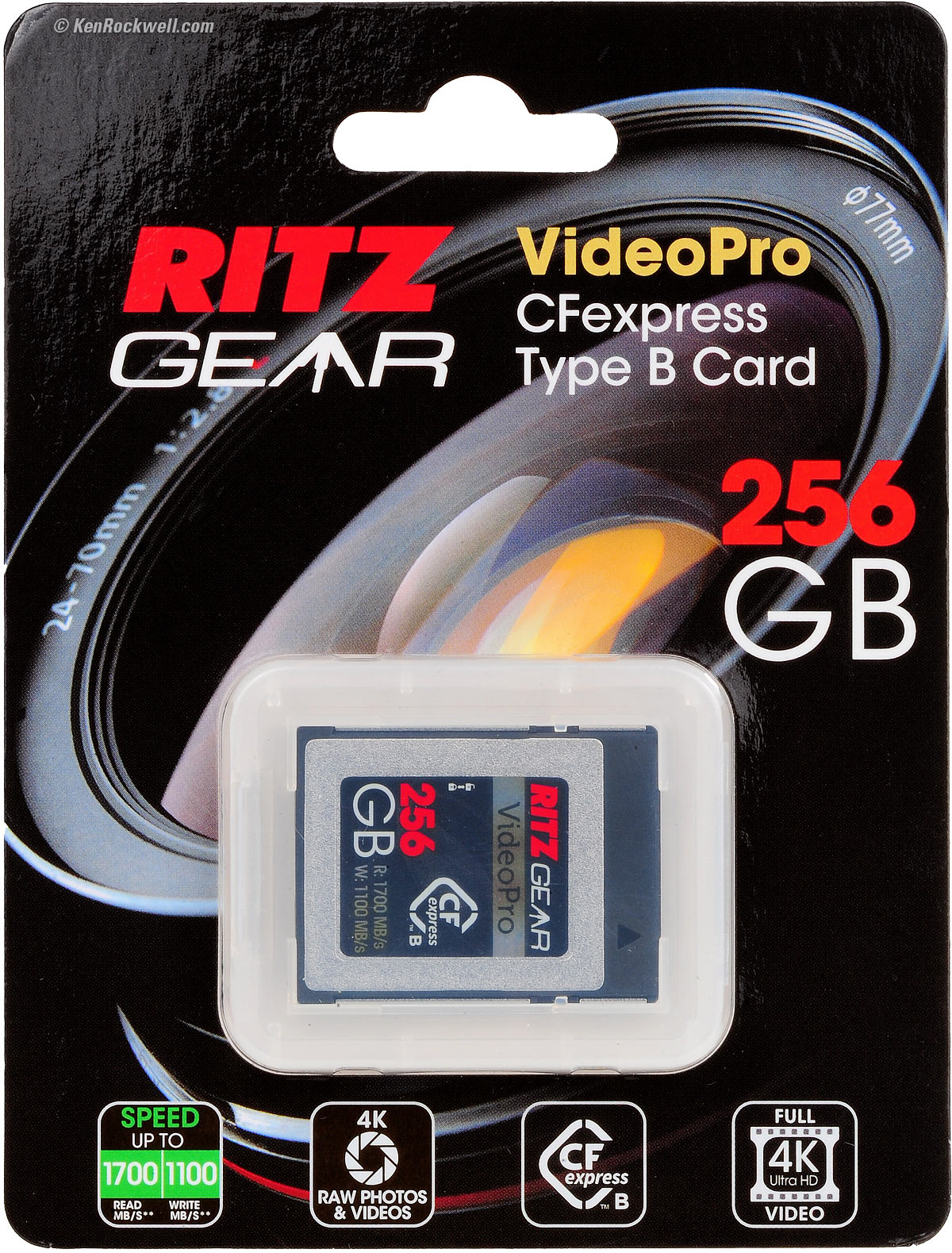 Ritz Gear 256 GB CFexpress1,700/1,100 MB/s Type BRitz Gear 256 GB CFexpress Type B ($90 for 128GB, $110 for 256GB, $500 for 512GB, $350 for 1TB). I'd get mine at Amazon. The Amazon listings say "NOT FOR NIKON" because if you don't update your firmware it might not work well, and Ritz didn't want anyone to be unhappy. My Z9 works awesome with my card, so be sure to run the latest firmware in Nikon and you're good. This all-content, junk-free website's biggest source of support is when you use those or any of these links to approved sources when you get anything, regardless of the country in which you live. Thanks for helping me help you! Ken.