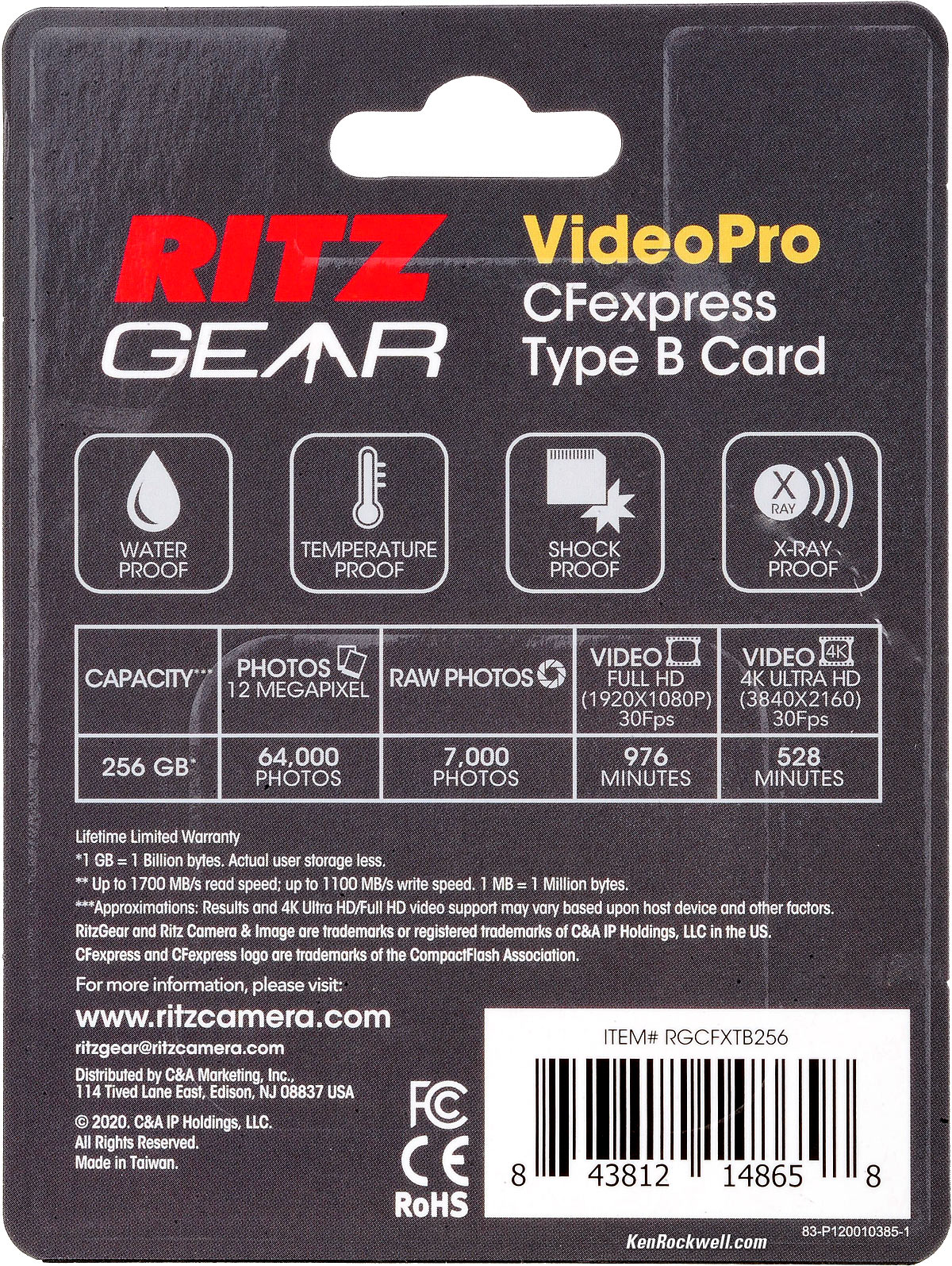I just got one of these to use in my Canon EOS R5. I'll admit that I'm not a video or raw shooter; I shoot JPG so I can work fast with small cards and not worry, except that the other slot besides the SD slot in my R5 is CFexpress. I love having a huge card in what to me is my second slot as a backup. I can shoot and shoot, and the backup card never fills. I'll be perfectly honest that my computers and laptops all have SD readers, not CFexpress readers, so I use SD cards as my primary storage, and this fancy ultra-high speed card serves as bulk backup - which it does brilliantly! I set my R5 to record the same thing to both cards as backup at MENU > WRENCH 1 > Record func+card/folder sel. > Rec options > Rec. to multiple. This Ritz Gear card is much less expensive than anything else since they're a new name in storage and trying to get the word out, and it works great. It's made in Taiwan, not China, which to me means much higher quality While it's the same size and will fit in XQD slots, it's very different logically and electrically and will not work. Only use this in cameras that use CFexpress cards. I measure 320 MB/s write and 777 MB/s read speeds wth my Mac, the BlackMagic test app and my RitzGear reader. Enjoy! Ritz Gear 256 GB CFexpress Card. bigger. February 2023: $90 for 128GB, $110 for 256GB, $500 for 512GB, $350 for 1TB. April 2021: $149 for 128GB, $198 for 256GB. © Ken Rockwell. All rights reserved. Tous droits réservés. Alle Rechte vorbehalten.