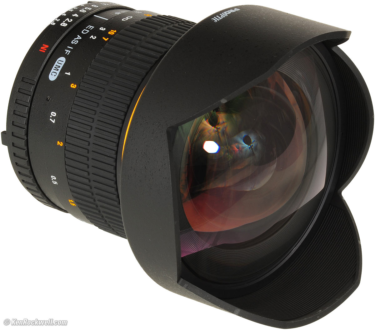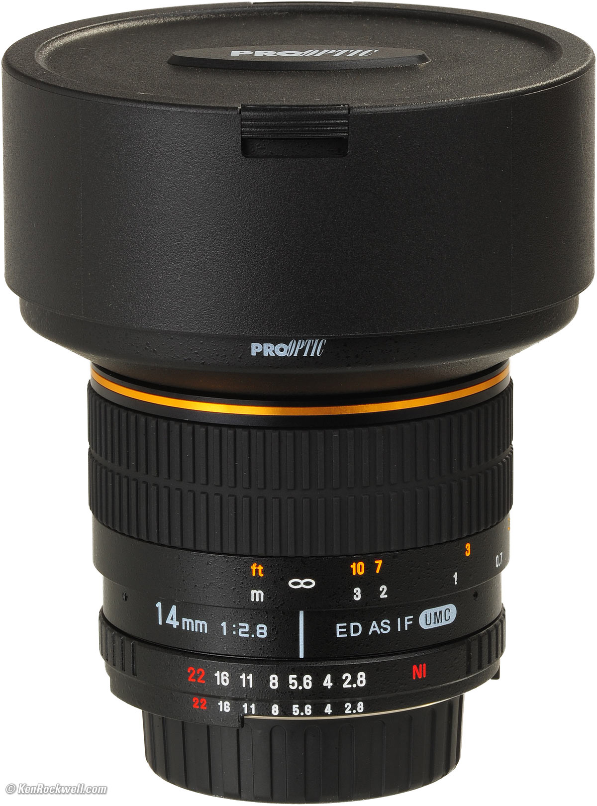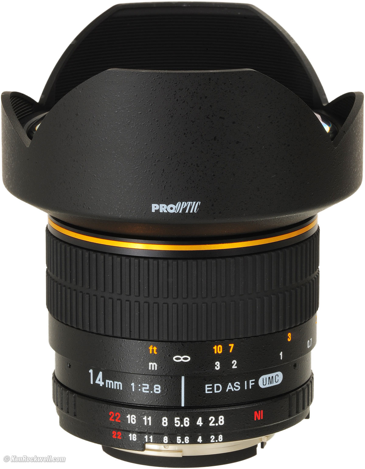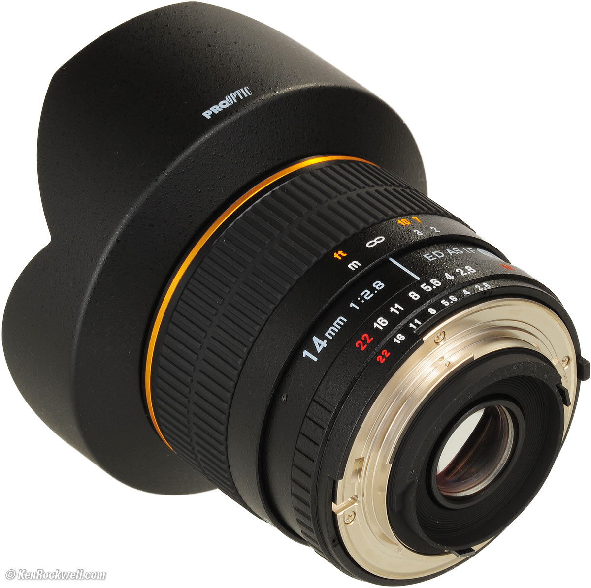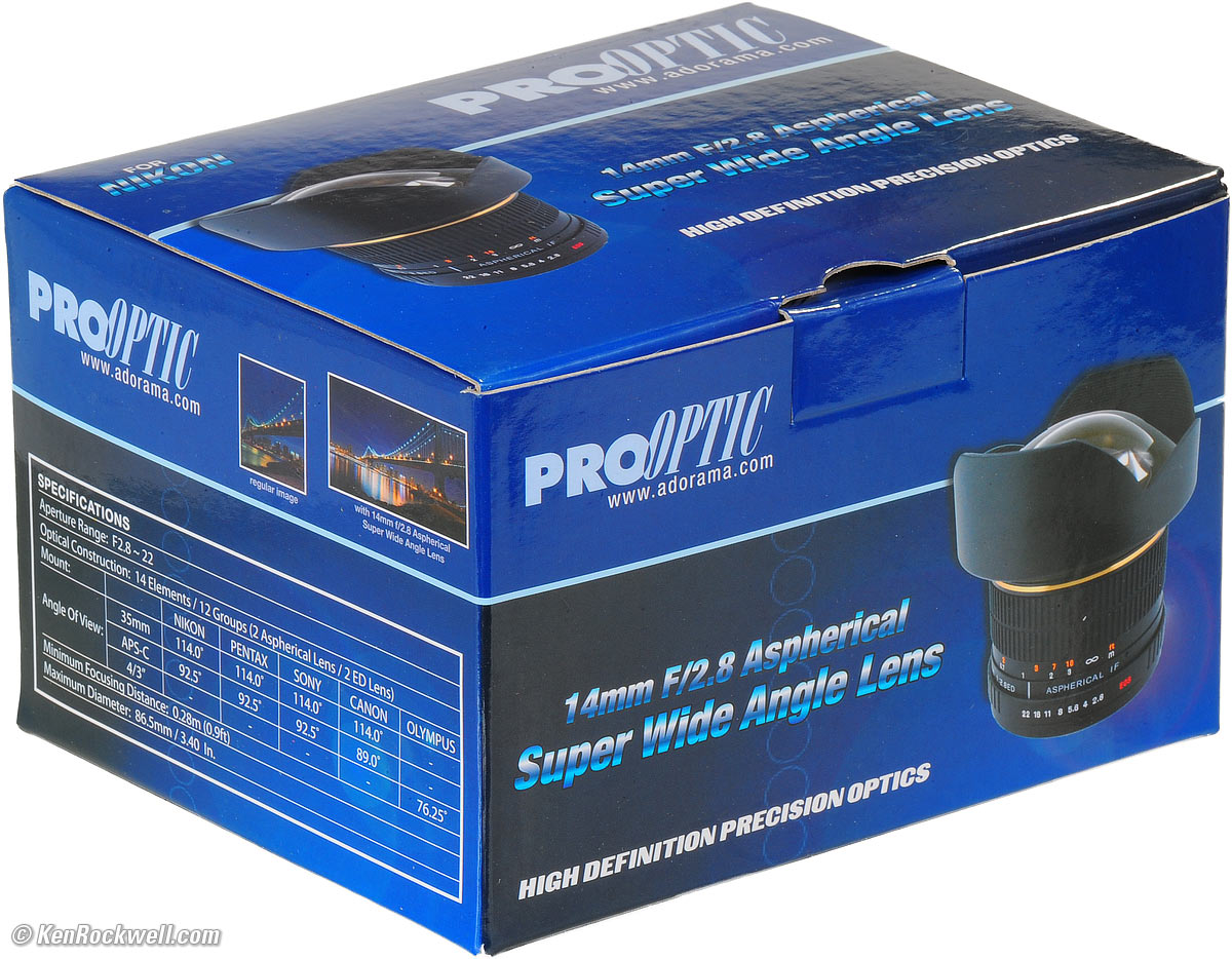Recommendations top Intro Specifications Performance Recommendations The Samyang 14mm f/2.8 is a manual-focus-only lens. In the hands of a creative photographer, it can create eye-catching images. If you're a pixel-counter, skip this lens and get a real Nikon or Canon 14mm, but if you're a student on a budget, heck, I would have bought one of these back when I was a student, if they had made these back then. (hint: Nikon's and Canon's 14mm lenses aren't exactly that sharp in the corners, either, but stil much better than this Samyang.) If you're on a budget and demand an ultra-sharp ultra-wide lens, look instead at Nikon's 18mm f/3.5 AI-s, which sells used for about the same price, uses filters, and is smaller and lighter. For half this price, look at either the Nikon 20mm f/3.5 AI-s or Nikon 20mm f/4 AI. This lens is sold under many names like ProOptic, Rokinon and Bower. It is the same lens, so buy whichever costs less. I've found the ProOptic brand, as sold at Adorama and shown here, is the least expensive.