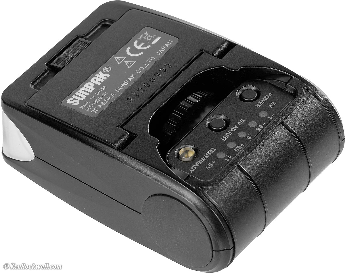 This tiny little flash is easy to take everywhere or leave on top of your camera all the time. It's more powerful than your built-in flash (if your camera has one), but it doesn't recycle as fast as the similarly powered Nikon SB-400, Canon 270EX II or Canon 220EX. This is a great idea as a tiny flash for Canon if either of the superb Canon 320EX or Canon 220EX is too big for you. For Nikon the Nikon SB-400 is the same size, has about a half-stop less measured power and costs more used, but is much better flash that's better made and recycles much faster than this RD2000. This flash comes from Sunpak in versions for Canon and for Nikon. Fuji buys this flash from Sunpak and resells it for their cameras as the Fuji EF-20 compact electronic flash.
