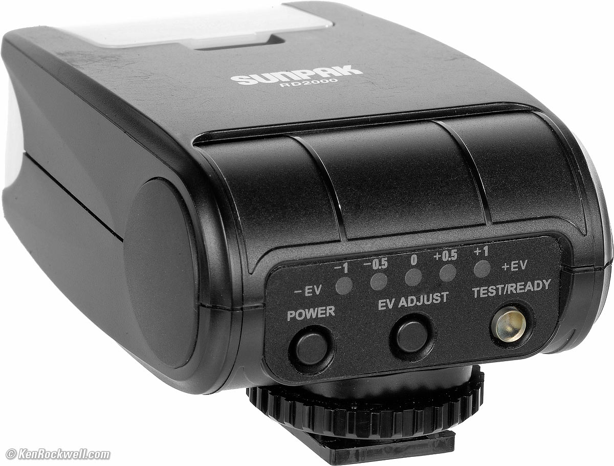 Sunpak RD2000Compact TTL Bounce FlashAccessories Performance Compared Sunpak RD2000 (available for Nikon, Canon and Fuji, runs on two AA cells, measured GN of 53'/14m, 5.5 oz./156g with two AA eneloop, about $150 new or $50 used if you know How to Win at eBay) on top of a Canon 5DS/R with 35mm f/1.4. bigger. This all-content, junk-free website's biggest source of support is when you use those or any of these links to my personally-approved sources when you get anything, regardless of the country in which you live. Get yours only from the approved sources I use myself for the best prices, service, return policies and selection. Thanks for helping me help you! Ken. May 2018 Canon Sony Nikon Fuji LEICA Zeiss all reviews Sunpak RD2000. bigger. IntroductionAccessories Performance Compared