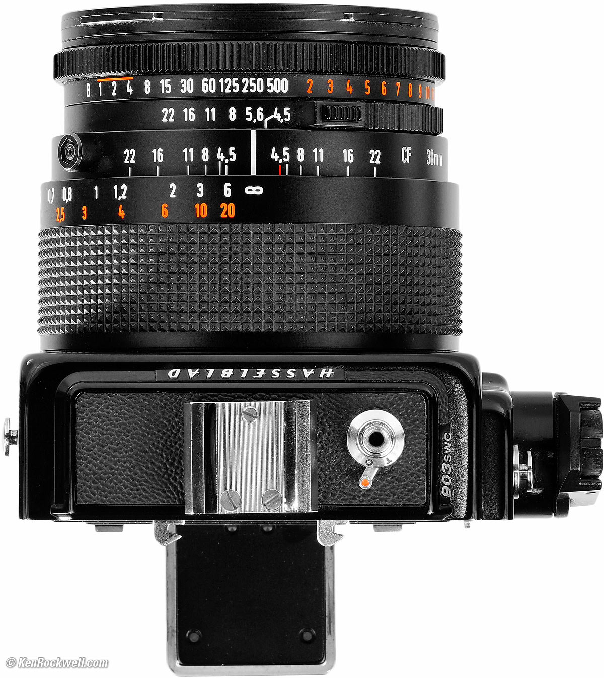 HASSELBLAD SWC & 903 SWCSuper Wide Camera (1954-2009)Specifications Performance Compared 1989 HASSELBLAD 903 SWC with fixed BIOGON T✻ 38mm f/4.5 lens and included finder enlarge (11.5 inches/0.29 meters close focus, Bay 60 filters, 33.2 oz./941 g). With an A12 6×6cm 120 back as shown it weighs about 48 oz./1,360 g and sells for about $3,600 used if you know How to Win at eBay. This all-content, junk-free website's biggest source of support is when you use those or any of these links to approved sources when you get anything, regardless of the country in which you live. Buy only from the approved sources I use myself for the best prices, service, return policies and selection. Thanks for helping me help you! Ken.
