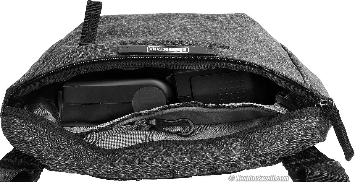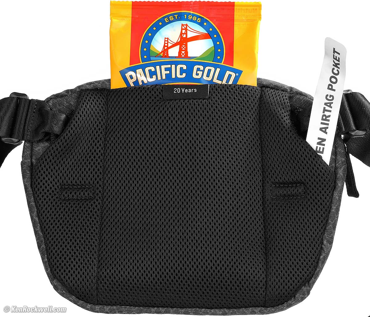 Back, Think Tank 20th Anniversary Sling Bag. bigger. The back is padded and has three pockets. The two side pockets are for pens, small screwdrivers and Air Tags, while the center can hold beef jerky, filters or a phone. I got mine directly from Think Tank. Enjoy!